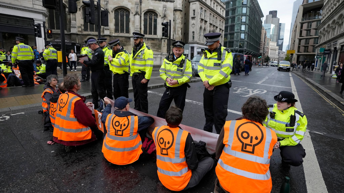 • Protestaktion: Aktivisten der Gruppe «Just Stop Oil» blockieren im Herbst 2022 eine Straße in London und fordern, zukünftige Gas- und Ölprojekte zu stoppen. - Foto: Kirsty Wigglesworth/AP/dpa