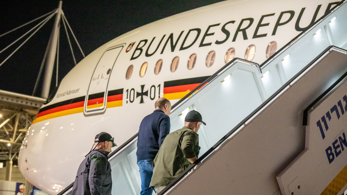 Nicht allen ist sofort klar, was passiert ist. Ein verdächtiger Gegenstand an Bord vielleicht? Es klärt sich aber schnell: Raketenalarm. Schon wieder. Etwa zwei Stunden vorher musste Scholz sich schon in der deutschen Botschaft in Tel Aviv zwei Mal in einem Schutzraum verschanzen. Diesmal geht es raus in die Dunkelheit aufs Flugfeld.
