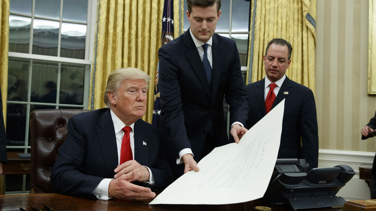 • Trump unterzeichnet im PrĂ€sidentenzimmer im Kapitol erste Dokumente. Traditionell sind dies Ernennungsurkunden, Memoranden, Proklamationen oder auch Anordnungen.