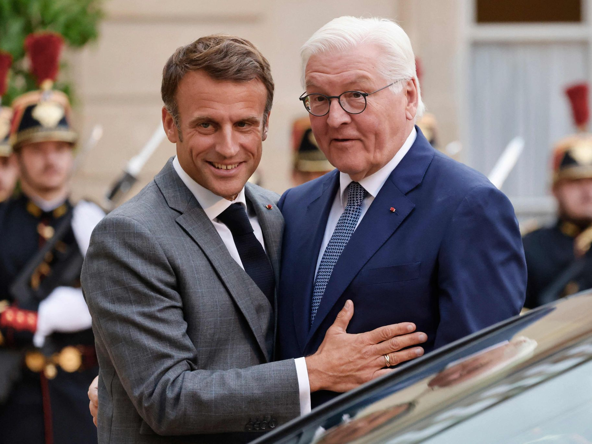 • Emmanuel Macron begrüßt Frank-Walter Steinmeier. - Foto: Ludovic Marin/AFP/dpa