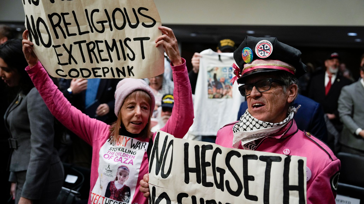 Die Gruppe «Code Pink» gehört zu jenen, die gegen Hegseths Nominierung protestieren. - Foto: Ben Curtis/AP/dpa