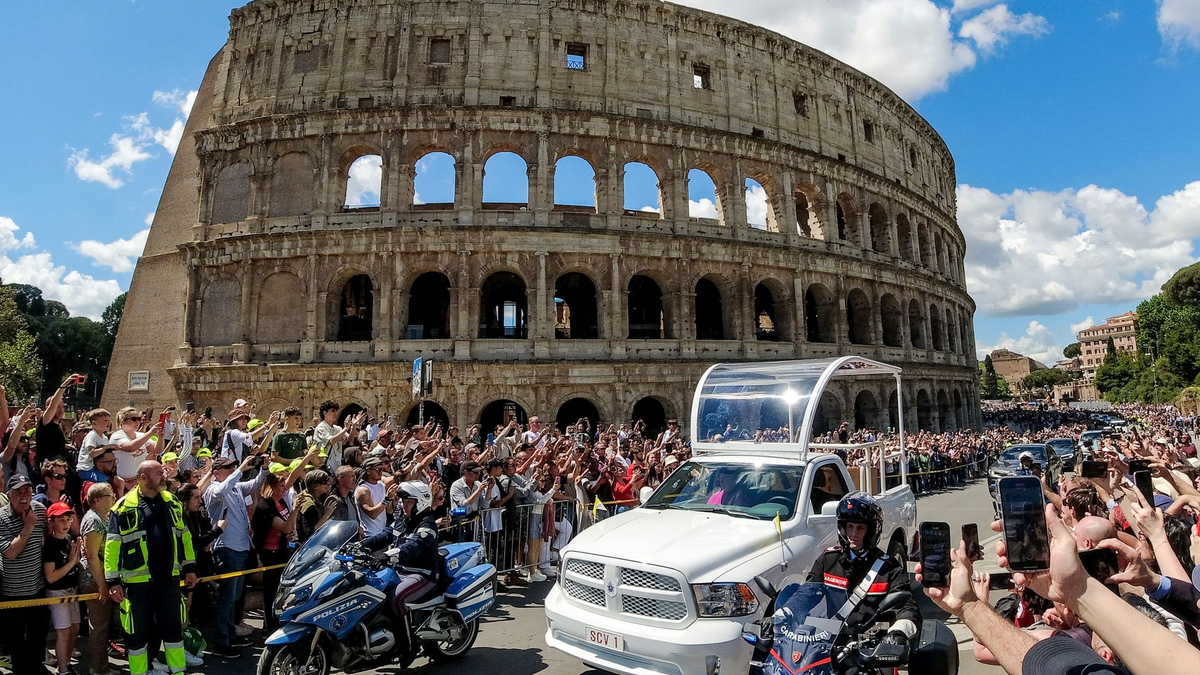 Danach wurde der Sarg des Papstes auf ein offenes Papamobil gelegt, das Franziskus auf seine letzte irdische Reise brachte. Auf den abgesperrten Straßen fuhr der Konvoi zunächst über den Tiber, dann durch das historische Zentrum Roms, über die Piazza Venezia, vorbei am Forum Romanum und dem wohl bekanntesten Wahrzeichen der Stadt, dem Kolosseum.