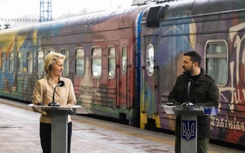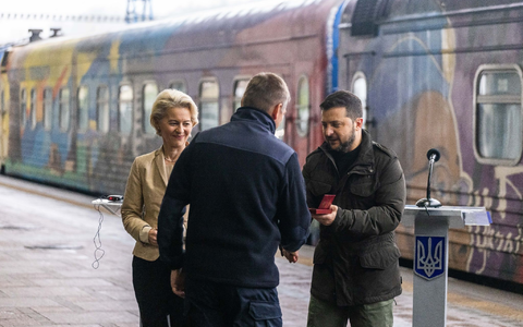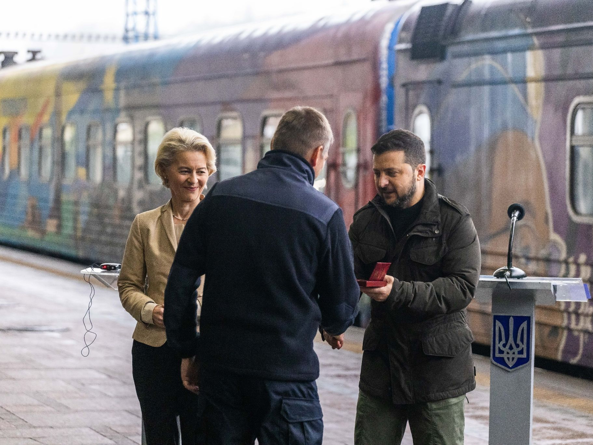 Selenskyj sagte mit Blick auf die Beitrittsverhandlungen, der Besuch finde in einem «historischen Moment» statt. «Diese Entscheidung wird nicht nur für die Ukraine, sondern auch für ganz Europa eine Schlüsselrolle in der Geschichte spielen.» Der ukrainische Präsident hatte von der Leyen bereits am Bahnhof begrüßt, was bei solchen Besuchen eher ungewöhnlich ist. Gemeinsam zeichneten sie anschließend Mitarbeiter der Bahn mit Medaillen aus.