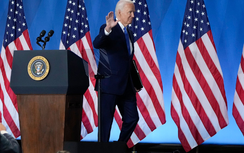 Mehrere Male lehnt er sich etwas ungelenk nach vorn über das Pult und flüstert mit aufgerissenen Augen Sätze ins Mikro - wohl um sie wirkungsvoller zu machen. Zwischendurch ballt Biden mehrfach die Faust, um Stärke zu demonstrieren - wie öfter auch in den vergangenen Tagen beim Nato-Gipfel, als er immer wieder auf die Rückzugsforderungen seiner Parteikollegen angesprochen wurde und die Faust als Antwort lieferte.