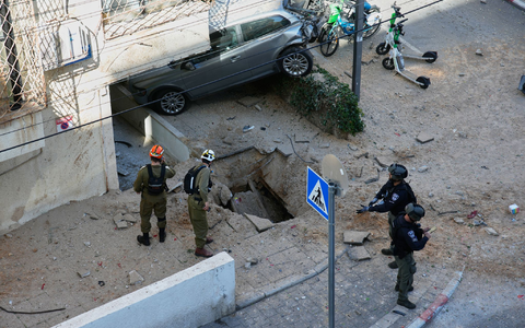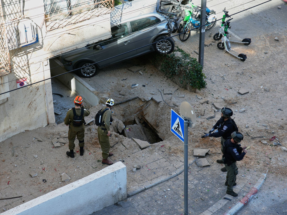 Nach dem Einschlag am Sonntag drĂ€ngen Polizisten Anwohner und Schaulustige zurĂŒck, wĂ€hrend sie die Gegend groĂflĂ€chig absperren. SpezialkrĂ€fte untersuchen zunĂ€chst, ob Explosionsgefahr besteht. Ein Auto wurde getroffen, daneben hat das Raketenteil ein groĂes Loch geschlagen.Â