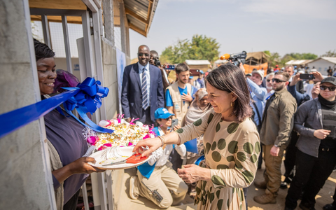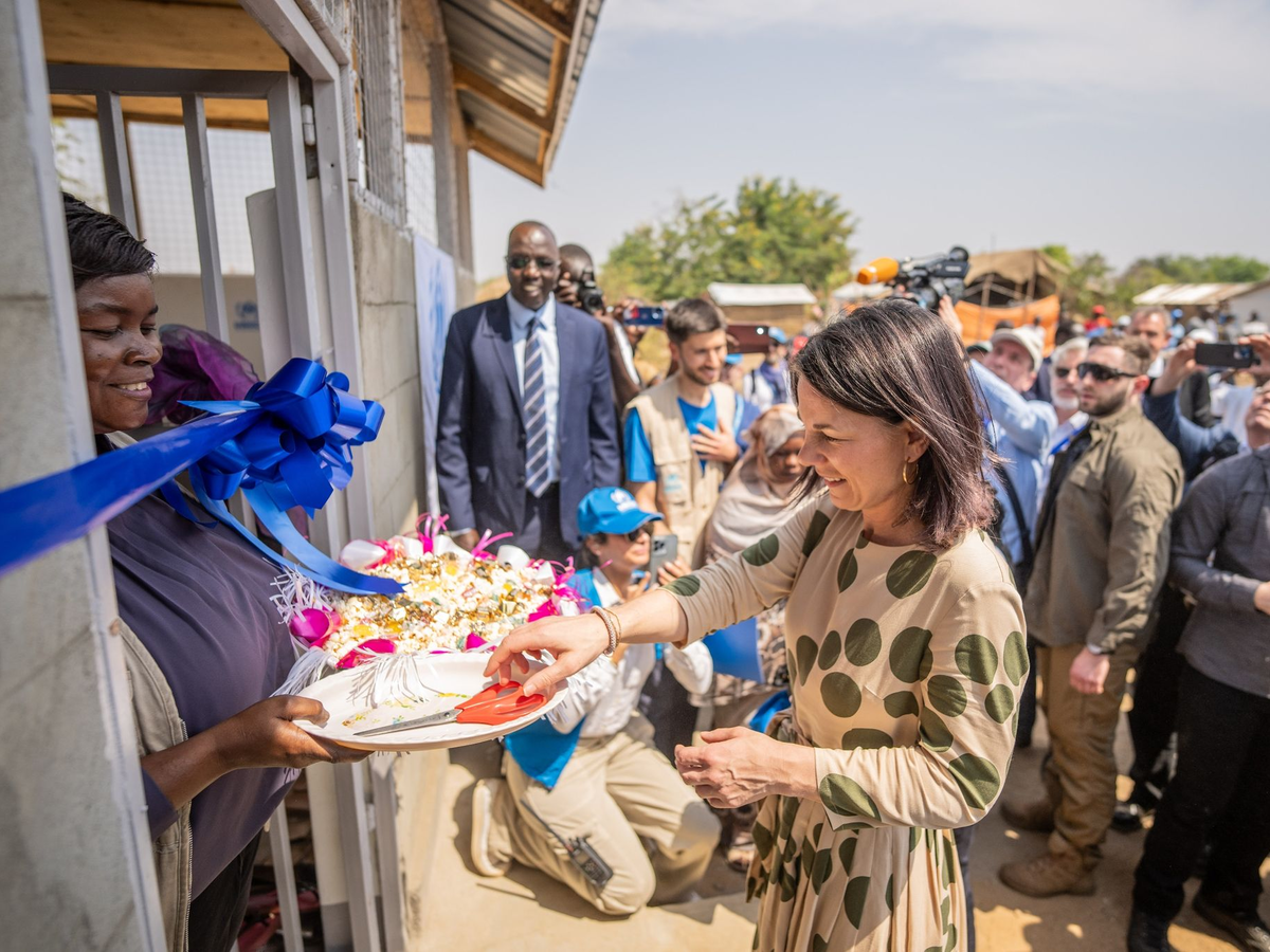 In der vom UN-Flüchtlingshilfswerk UNHCR betreuten Flüchtlingssiedlung Gorom wurde die Bundesaußenministerin von dutzenden Frauen und Kindern begeistert empfangen. Baerbock eröffnete ein neues Frauenhaus und durchtrennte dazu ein Schleifenband in der UN-Farbe blau. In dem Haus haben unter anderem neu aus dem Sudan angekommene Frauen die Gelegenheit, bei Teestunden Erfahrungen auszutauschen.