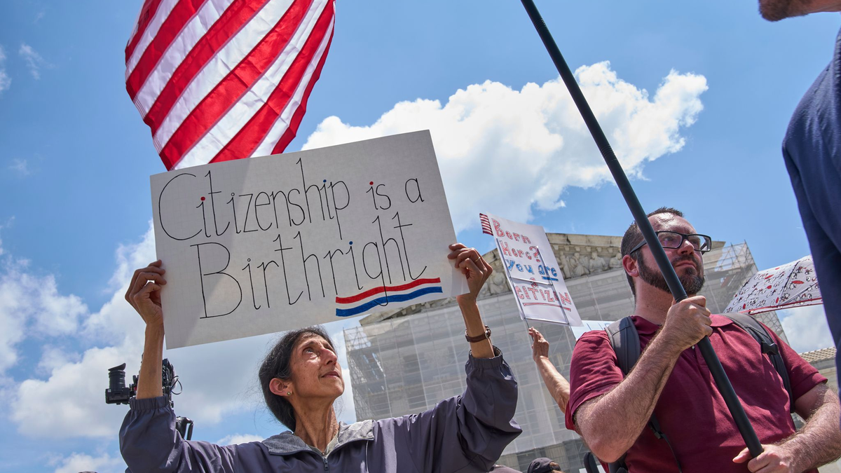 • Protest begleitet eine Anhörung zum Streit um das Geburtsrecht vor dem Gerichtsgebäude im Mai: Demonstranten setzen ein Zeichen für den Erhalt des in der Verfassung verankerten Geburtsrechts. (Archivbild) - Foto: Jacquelyn Martin/AP/dpa