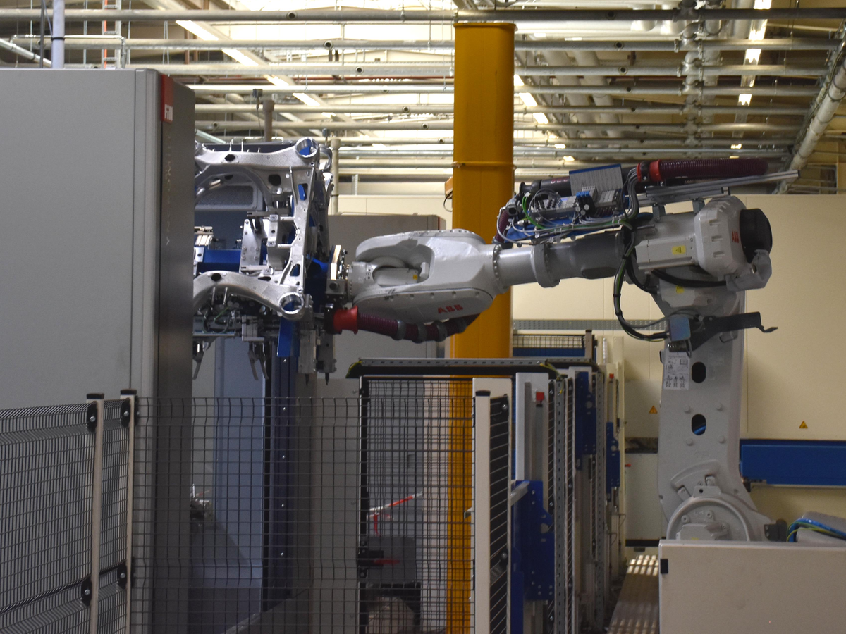 Deren Komplexität ist enorm: Nach dem Einlegen der Rohteile in Glühgestelle und dem Eintransport in die Wärmebehandlung erfolgt in zwei bemannten und einer unbemannten Station eine Rissprüfung. Nach dem Entfernen der Gussgrate werden die Teile in Bearbeitungszentren durch Fräsen, Bohren und Gewindeschneiden bearbeitet und anschließend entgratet und gereinigt. Durch das Einpressen der passenden Gummilager erhalten die rund 25 kg schweren Hinterachsträger ihre fahrzeugspezifische Ausführung, ehe sie die End-of-Line-Prüfung absolvieren und in Transportgestelle verpackt werden. Der gesamte Prozess wird für jedes Stück lückenlos rückverfolgbar dokumentiert.