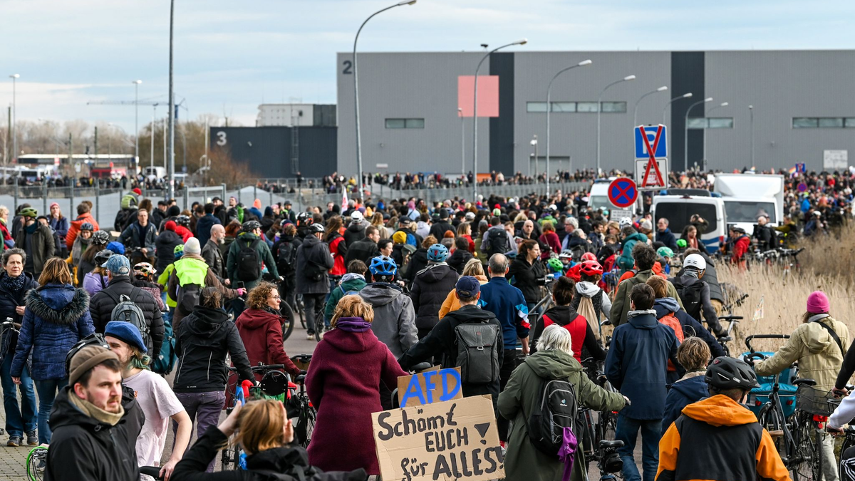 Tesla-Chef Elon Musk lässt sich beim AfD-Wahlkampfauftakt feiern. - Foto: Sebastian Willnow/dpa