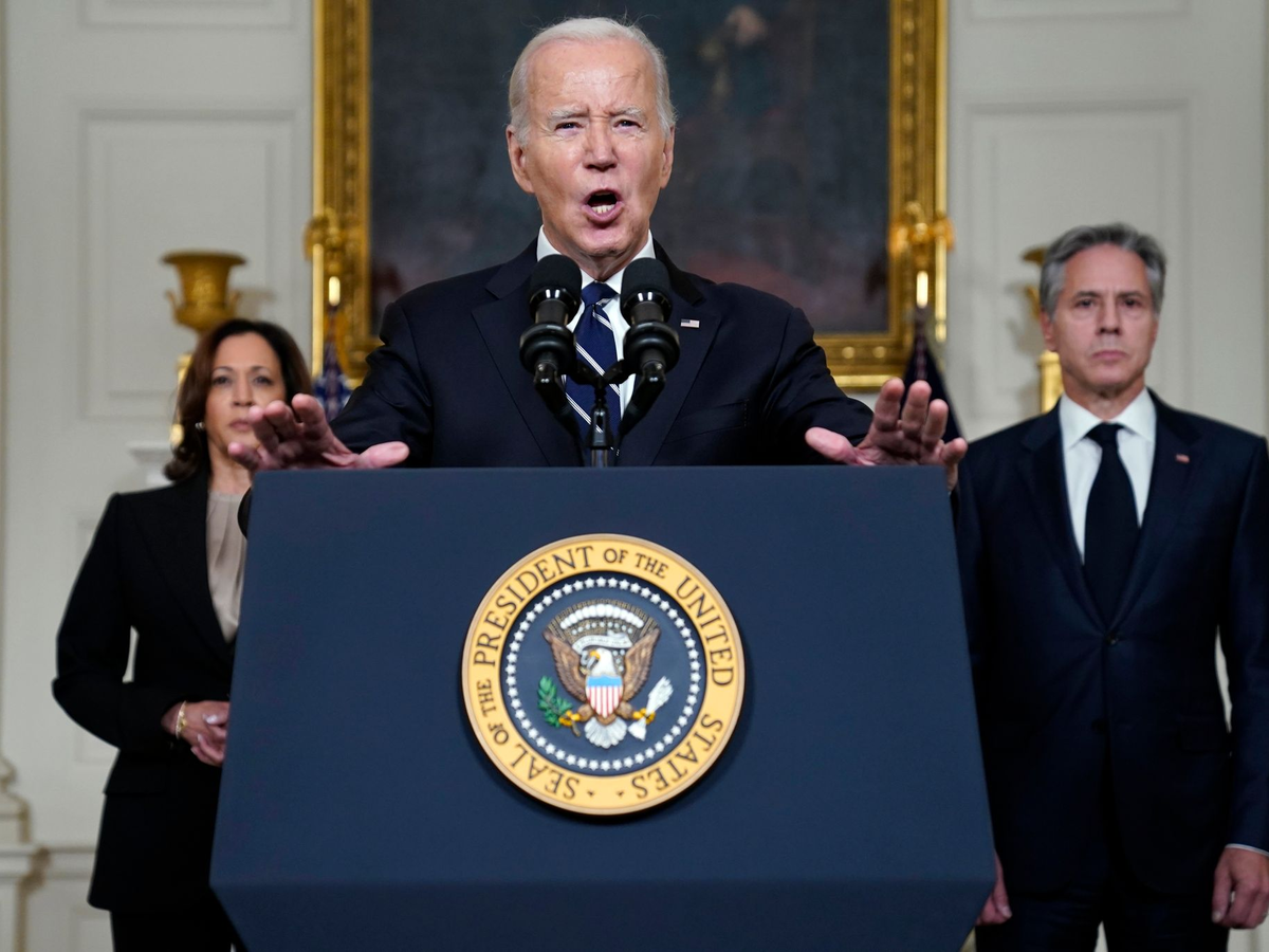 US-PrĂ€sident Joe Biden (M) spricht im WeiĂen Haus auf zur Lage nach dem Hamas-GroĂangriff auf Israel. Im Hintergrund: VizeprĂ€sidentin Kamala Harris und AuĂenminister Antony Blinken. - Foto: Evan Vucci/AP