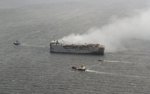 Brennender Frachter am neuen Ankerplatz angekommen