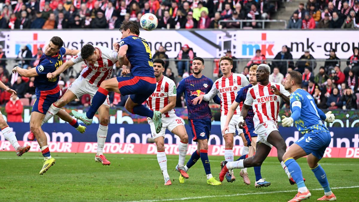 Die Leipziger waren von Anpfiff an spielbestimmend, hatten viel Ballbesitz und stellten die Kölner Abwehr oft über die schnellen Offensivspieler um Yan Diomande vor Probleme. Doch zwingende Möglichkeiten blieben anfangs aus. Der Führungstreffer fiel auch nicht aus dem Spiel heraus, sondern nach einem Standard: Nach dem Freistoß von David Raum war Baumgartner mit dem Kopf zur Stelle.