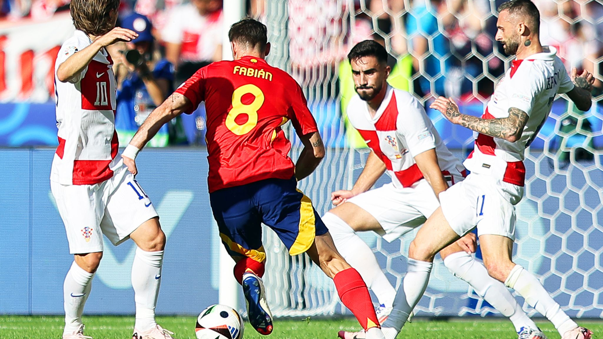 Spaniens Fabian Ruiz (2.v.l) setzt sich zunächst gegen Kroatiens Luka Modric (l-r), Josip Sutalo und Marcelo Brozovic durch und sorgt dann für das zwischenzeitliche 2:0. - Foto: Andreas Gora/dpa
