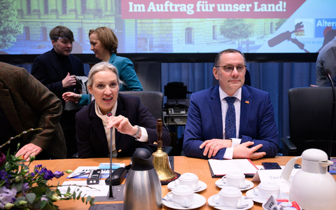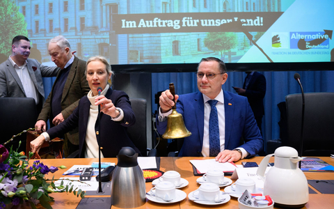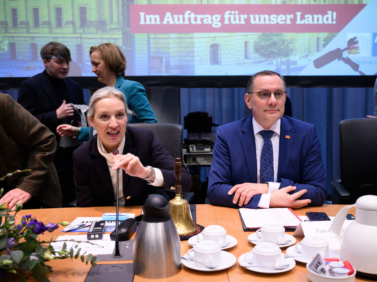 25.02.2025 - 12:11:54 | dpa.deZwei Tage nach der Bundestagswahl hat sich in Berlin die aufs das Doppelte angewachsene AfD-Fraktion konstituiert. Die Abgeordneten bestätigten das Führungsduo Alice Weidel und Tino Chrupalla mit großer Mehrheit im Amt. Die Fraktion steckte außerdem ihren Kurs für die kommende Legislaturperiode ab und meldete Anspruch auf einflussreiche Posten im neugewählten Bundestag an.