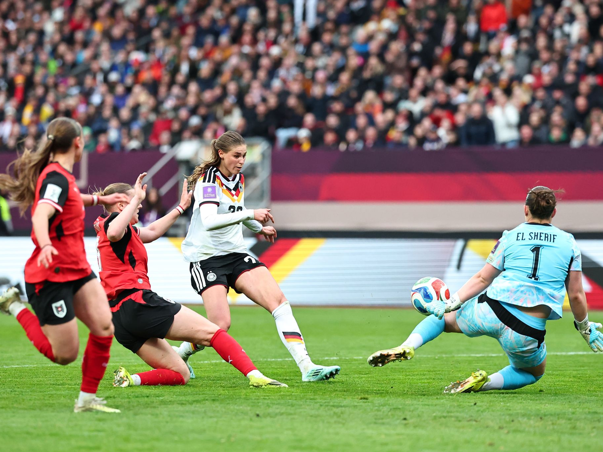 Ohne ihre Kapitänin, für die Carlotta Wamser kam, drehte die DFB-Elf vor allem nach der Pause auf. Die Tore gegen die weiter punktlosen Österreicherinnen erzielten Nicole Anyomi (17. Minute), Vivien Endemann (52.), Sarah Puntigam (68./Eigentor), Jule Brand (76.) und Lea Schüller (83.) vor 24.237 Zuschauern im Frankenstadion. Für Österreich traf Chiara D'Angelo (77.).