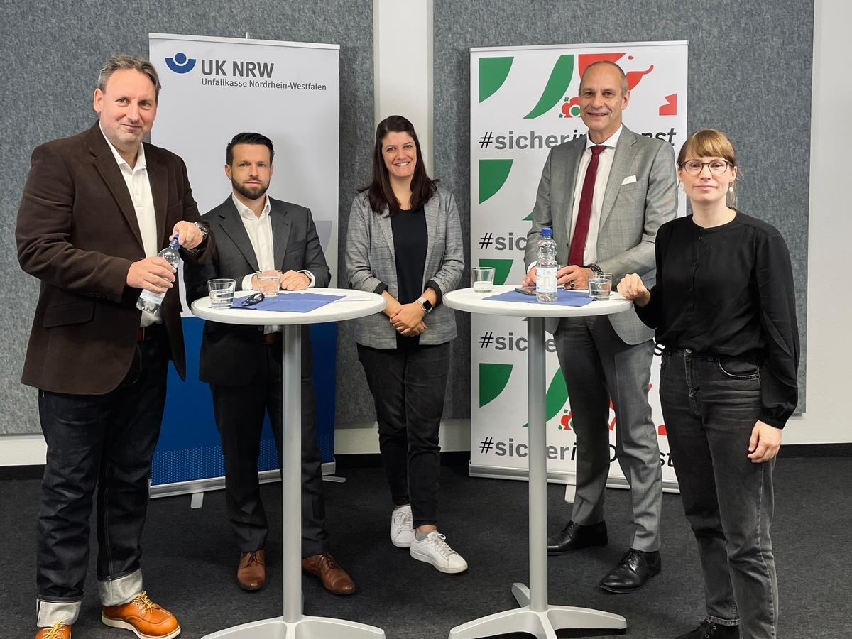 In der einstündigen Gesprächsrunde beleuchteten Beschäftigte sowie Expertinnen und Experten aus Medizin, Pflege, Krankenhausleitung, Präventionsarbeit und Polizei die vielseitigen Aspekte von Gewalt und Konflikten im Gesundheitswesen. Gesprächsgäste waren Nils Krog, Präsidiumsmitglied der Krankenhausgesellschaft Nordrhein-Westfalen (KGNW) und Geschäftsführer des Klinikträgers Ategris, der die Situation auf Landesebene einordnete und die Verantwortung der Krankenhausleitungen betonte, sowie Simon Härtel, Pflegedirektor des Evangelischen Krankenhauses Mülheim, der die Herausforderungen aus der Perspektive der Pflegekräfte und ebenso der pflegerischen Leitungsebene schilderte. Dr. Leonie Malburg, Ärztin am Celitinnen-Krankenhaus St. Hildegardis in Köln, brachte Einblicke aus der ärztlichen Praxis ein, während Frank Böttcher von der Polizei Recklinghausen als Experte für Kriminalprävention und Opferschutz die polizeiliche Sicht darstellte. Moderiert wurde die Veranstaltung von Anne Herr von der Stabsstelle des Präventionsnetzwerks #sicherimDienst.