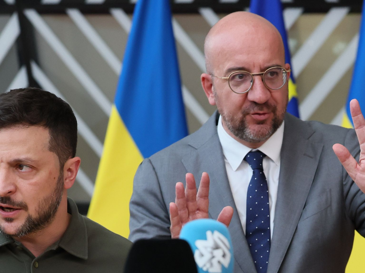 Der ukrainische PrĂ€sident Wolodymyr Selenskyj (l) und EU-RatsprĂ€sident Charles Michel in BrĂŒssel. - Foto: Benoit Doppagne/Belga/dpa