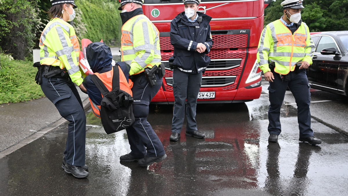 Dabei wurde ein Demonstrant, der rechts vor der Stoßstange auf der Straße saß und sich steif gemacht hatte, nach vorn geschoben. Verletzt wurde laut Polizei niemand. Der Demonstrant stand auf, der Lkw fuhr weiter. «Wir gehen davon aus, dass der Fahrer den Blockierer gesehen hat», sagte der Sprecher. Der Lkw-Fahrer meldete sich später bei der Polizei.