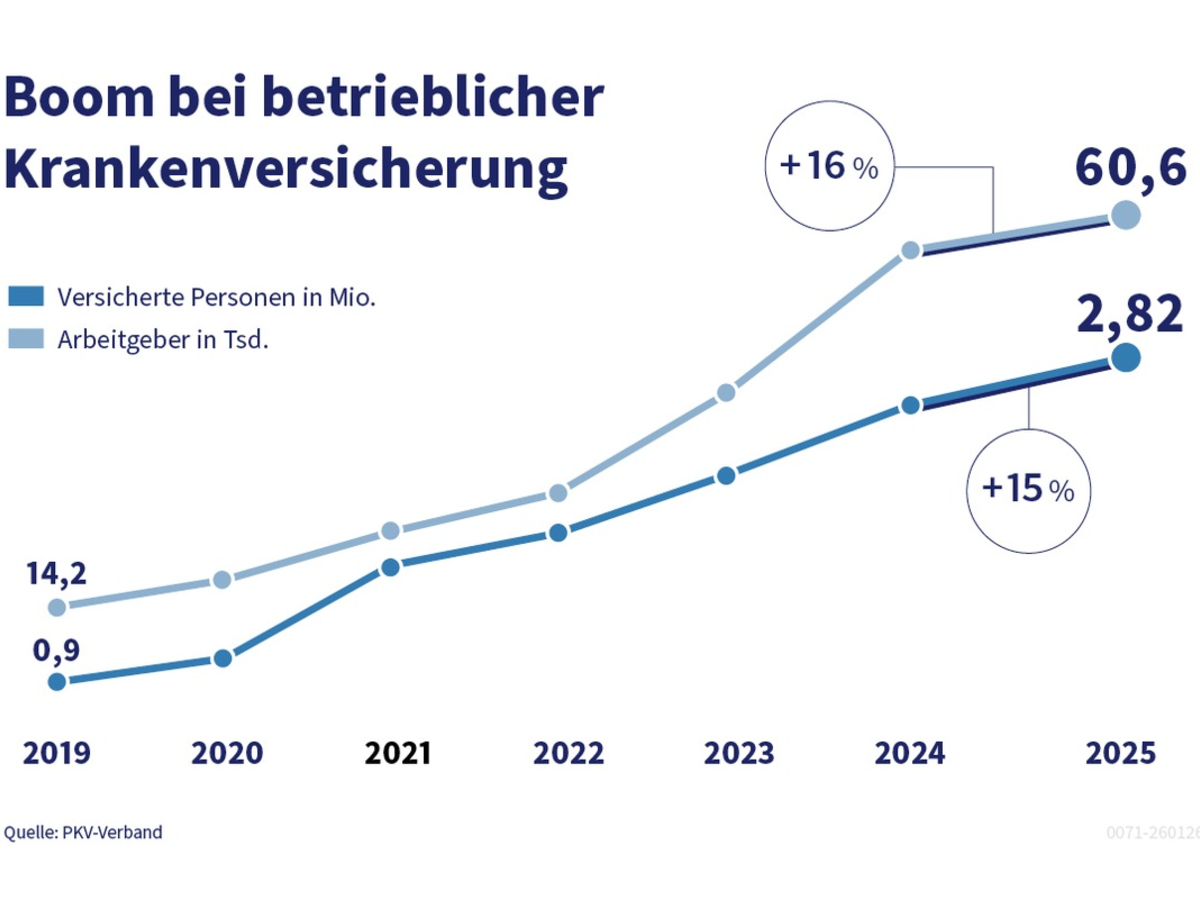 Die bPV gehört zur betrieblichen Krankenversicherung (bKV), die auch 2025 dynamisch gewachsen ist. Mittlerweile bieten 60.000 Unternehmen in Deutschland ihren Beschäftigten eine vollständig arbeitgeberfinanzierte bKV an - ein Zuwachs von 15,6 Prozent gegenüber dem Vorjahr (+8.200 Unternehmen).