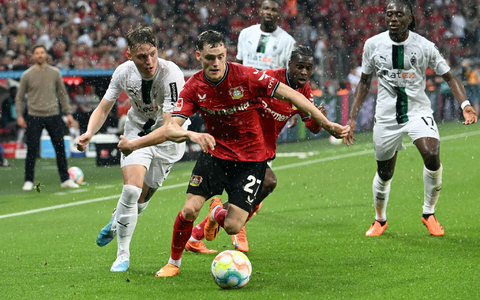 In den Anfangsminuten drückte Leverkusen die Gäste tief in die eigene Hälfte. Einen ersten harmlosen Abschluss von Edmond Tapsoba (3.) konnte Moritz Nicolas problemlos parieren. Wenig später (9.) zeigte der Gladbacher Torhüter einen überragenden Fuß-Reflex, als Patrick Schick einen Freistoß von Alejandro Grimaldo – der erstmals in der Bundesliga zu Spielbeginn als Kapitän auflief – per Kopf aufs Tor verlängerte.