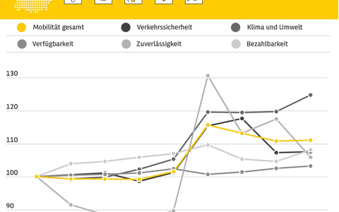 Die "Bezahlbarkeit" entwickelte sich 2023 positiv gegenĂŒber dem Vorjahr und lag bei 108 Punkten. Entscheidend fĂŒr die Entwicklung war insbesondere der Anstieg des verfĂŒgbaren Einkommens, der inflationsbedingte Preissteigerungen im Verkehrssektor weitgehend kompensierte. Bei der "VerfĂŒgbarkeit" gab es einen Anstieg um einen Punkt auf 103 Punkte. Die Entwicklung ist als Ergebnis eines wachsenden MobilitĂ€tsangebots zu bewerten, das sich nach der Pandemie weitgehend erholt hat. So gab es einen deutlichen Zuwachs an Carsharing-Fahrzeugen und auch im öffentlichen Verkehr verzeichnet der MobilitĂ€tsindex eine deutliche Verbesserung.