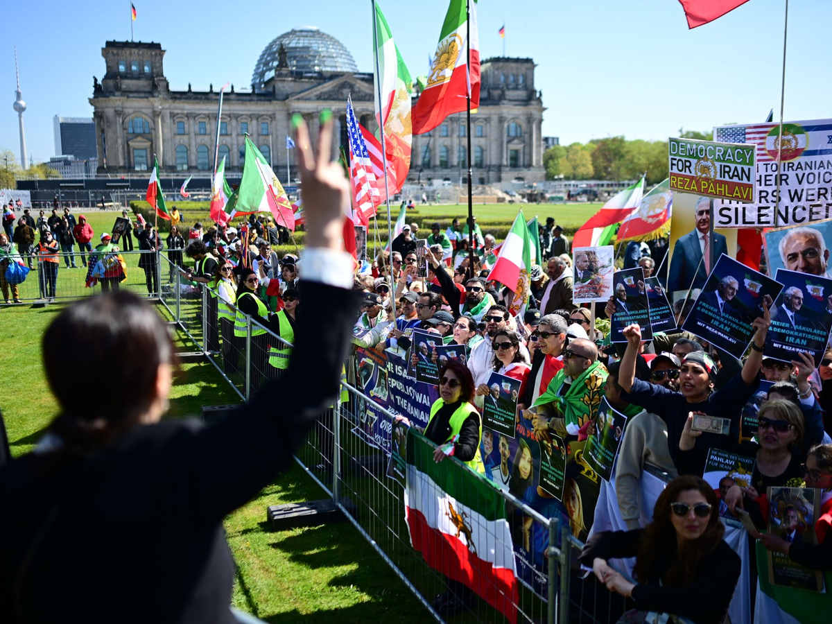 Rund 1.000 Unterstützer demonstrierten mittags am Berliner Reichstagsgebäude für einen Machtwechsel. Viele schwenkten Fahnen mit dem Emblem der 1979 von Islamisten gestürzten Monarchie, dem Löwen und der Sonne.