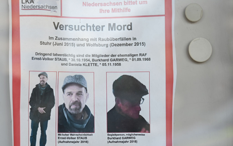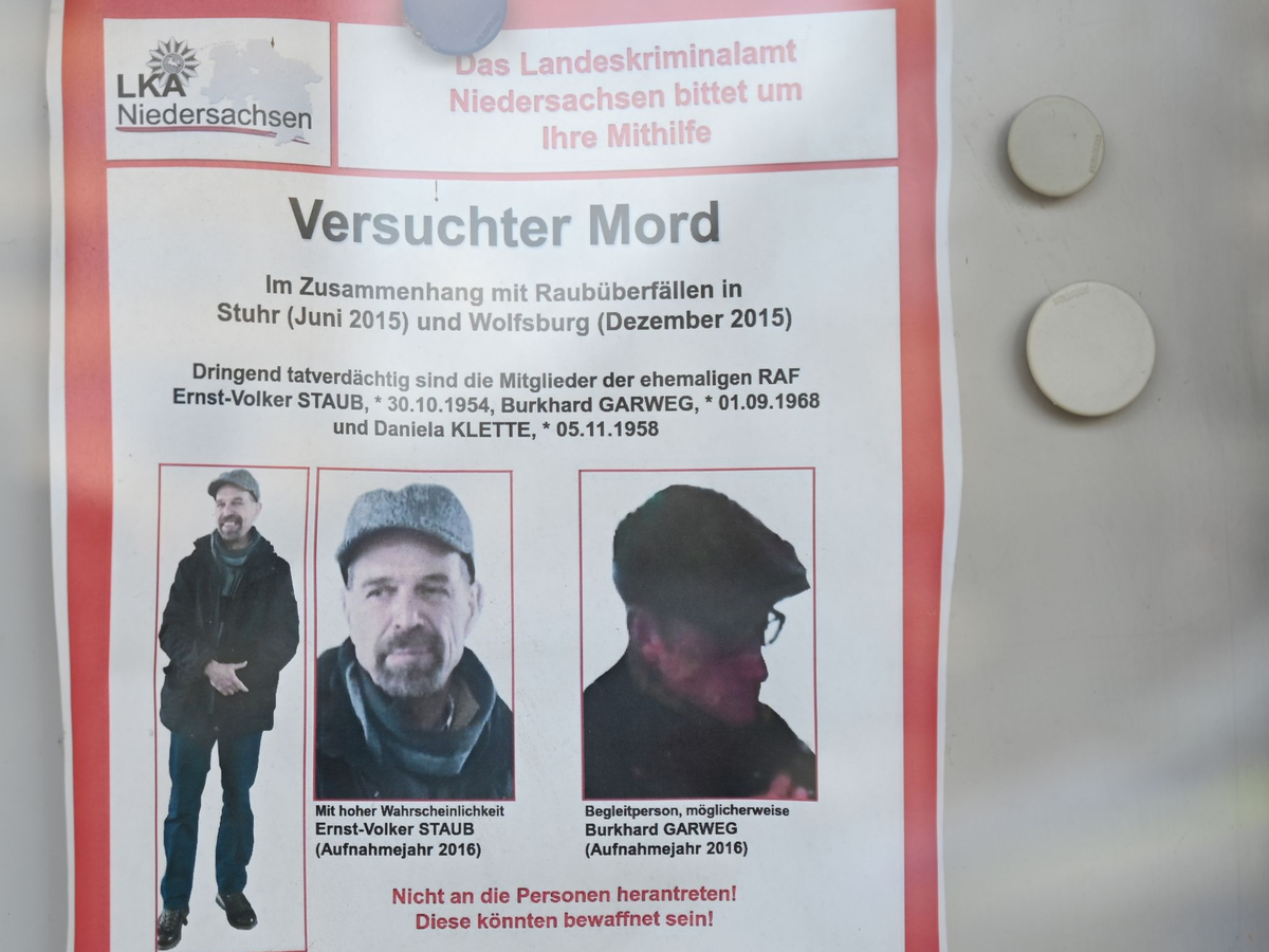 Den Beschuldigten Ernst-Volker Staub, Daniela Marie Luise Klette und Burkhard Garweg wird unter anderem versuchter Mord sowie eine Serie von schweren Raubüberfällen vorgeworfen. Die gesuchten drei ehemaligen RAF-Terroristen sind bereits in den 90er Jahren untergetaucht. DNA-Spuren brachten die Ermittler darauf, dass die drei für Raubüberfälle auf Geldtransporte und Supermärkte im Zeitraum zwischen 1999 und 2016 verantwortlich sein könnten.