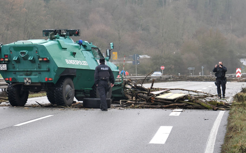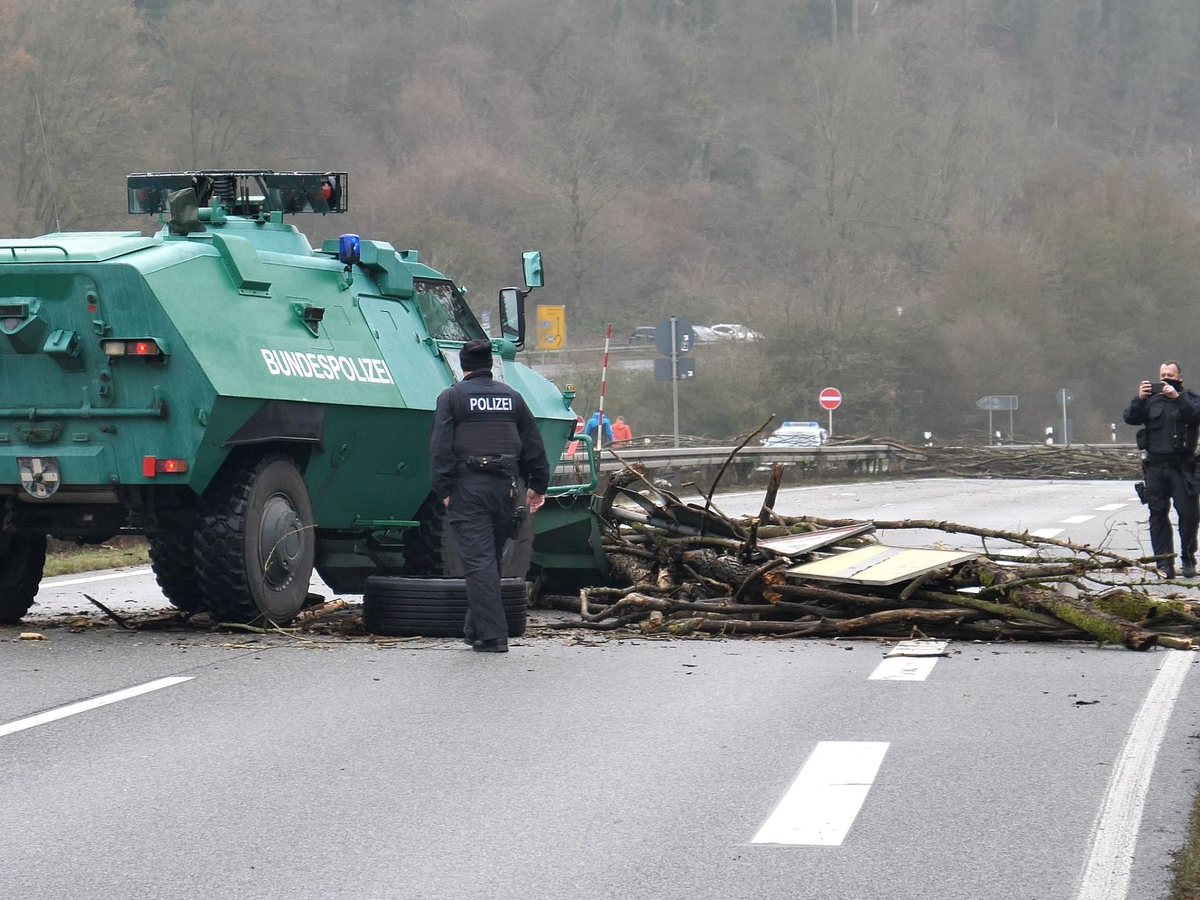 Demonstranten blockierten unter anderem zeitweise die Bundesstraßen 49 und 429. Rund 2.000 Menschen besetzten die Bundesstraße 49. Die Polizei setzte Wasserwerfer ein, nachdem trotz mehrmaliger Aufforderung die Straße nicht freigemacht worden sei. Auch auf der B429 kam es zu einer Blockade und zum Einsatz eines Wasserwerfers. Zudem wurden Beamte laut Polizei auf der Konrad-Adenauer-Brücke in der Stadt mit Flaschen beworfen und nahe der Messehallen mit Leuchtspurmunition beschossen. An einer Blockadestelle hätten sich Beamte mit Pfefferspray gegen Steinewerfer verteidigt.