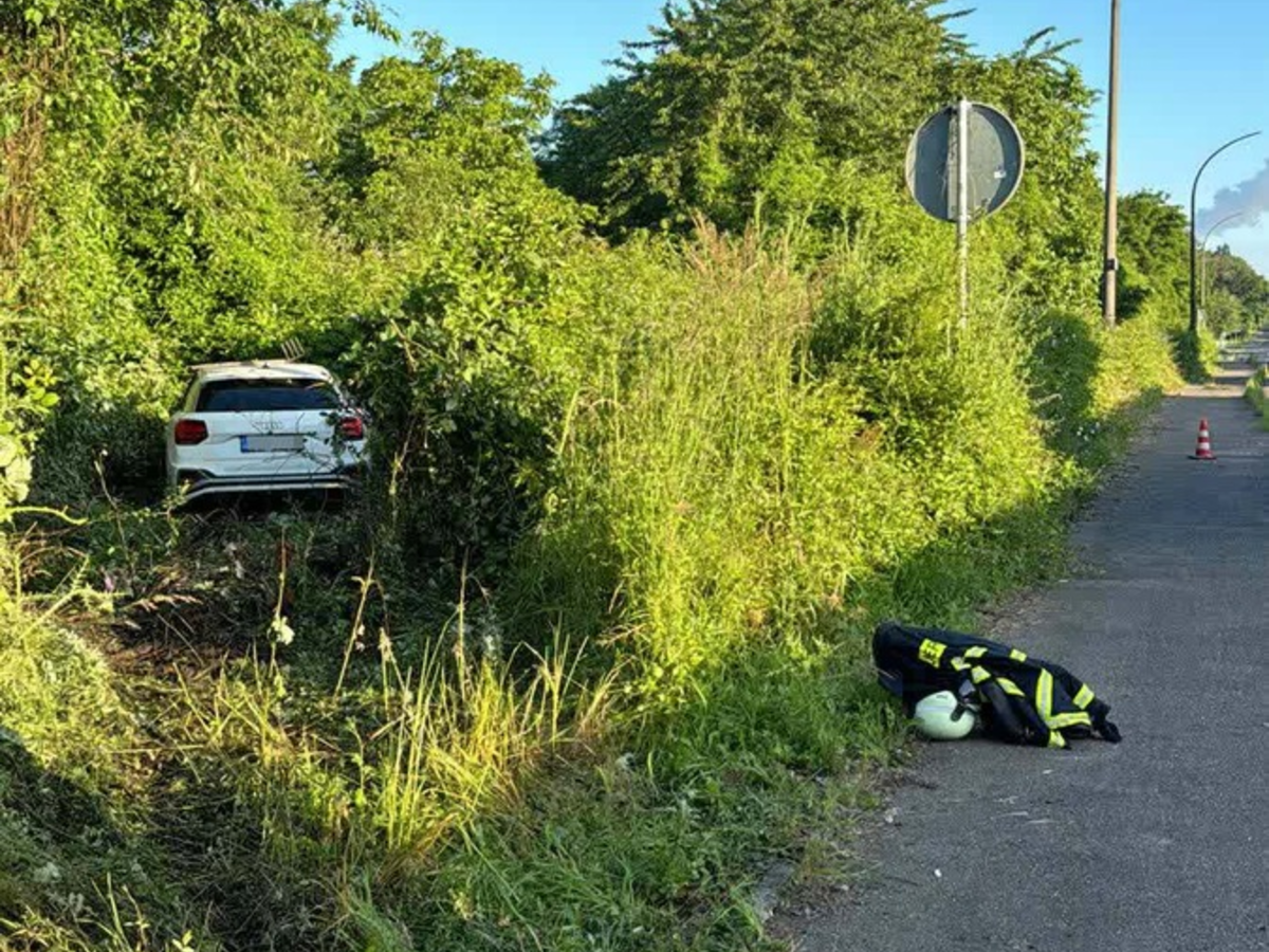 Gegen 6 Uhr versendet der verunfallte Audi einen automatischen Notruf. Polizisten und Rettungskräfte trafen wenig später das Unfallfahrzeug auf der Industriestraße im Übergang zum Bertrams-Jagdweg an. Es befand sich mehrere Meter abseits der Straße im Gestrüpp. Zur Bergung des Audis, der zuvor eine kleine Mauer und einen Zaun durchstoßen hatte, Schnitten die Einsatzkräfte die Sträucher um das Fahrzeug zurück.