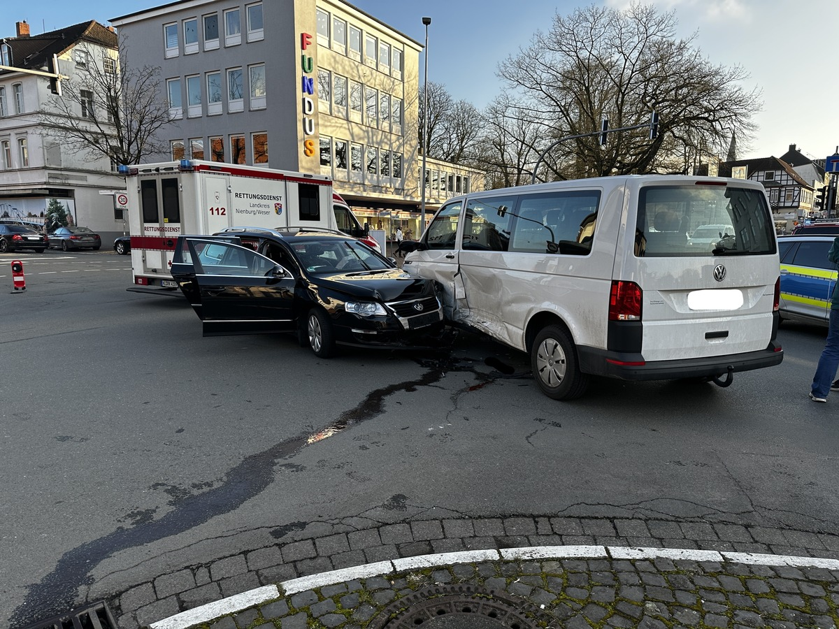 31582 Nienburg/Weser - "Kino - Kreuzung" - (ber) Am 01.03.2025 gegen 16:18 Uhr ist es auf der "Kino - Kreuzung" der Hafenstraße / Verdener Straße / Brückenstraße / Lange Straße in 31582 Nienburg/Weser zu einem Verkehrsunfall zwischen zwei PKW gekommen. Der Verkehrsunfallverursacher (81 Jahre aus der SG Weser - Aue) fährt hierbei mutmaßlich aufgrund eines medizinischen Notfalls trotz Rotlichts mit seinem VW Passat von der Hafenstraße in den Kreuzungsbereich ein. Mittig im Kreuzungsbereich kollidiert der Verkehrsunfallverursacher mit einem VW Bulli, der von der Verdener Straße aus in die Kreuzung einfährt. Der Verkehrsunfallverursacher wird unmittelbar nach der Kollision von dem, durch den Verkehrsunfall, leichtverletzten Unfallgegner (49 Jahre aus der Stadt Nienburg) und Passanten aus seinem Fahrzeug gerettet und es wird 1. Hilfe geleistet. An den beteiligten PKW entsteht ein Sachschaden in Höhe von ca. 15.000 Euro. Der Kreuzungsbereich ist für die Dauer der Verkehrsunfallaufnahme und des Abschleppens der PKW partiell gesperrt worden.