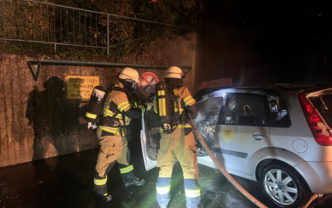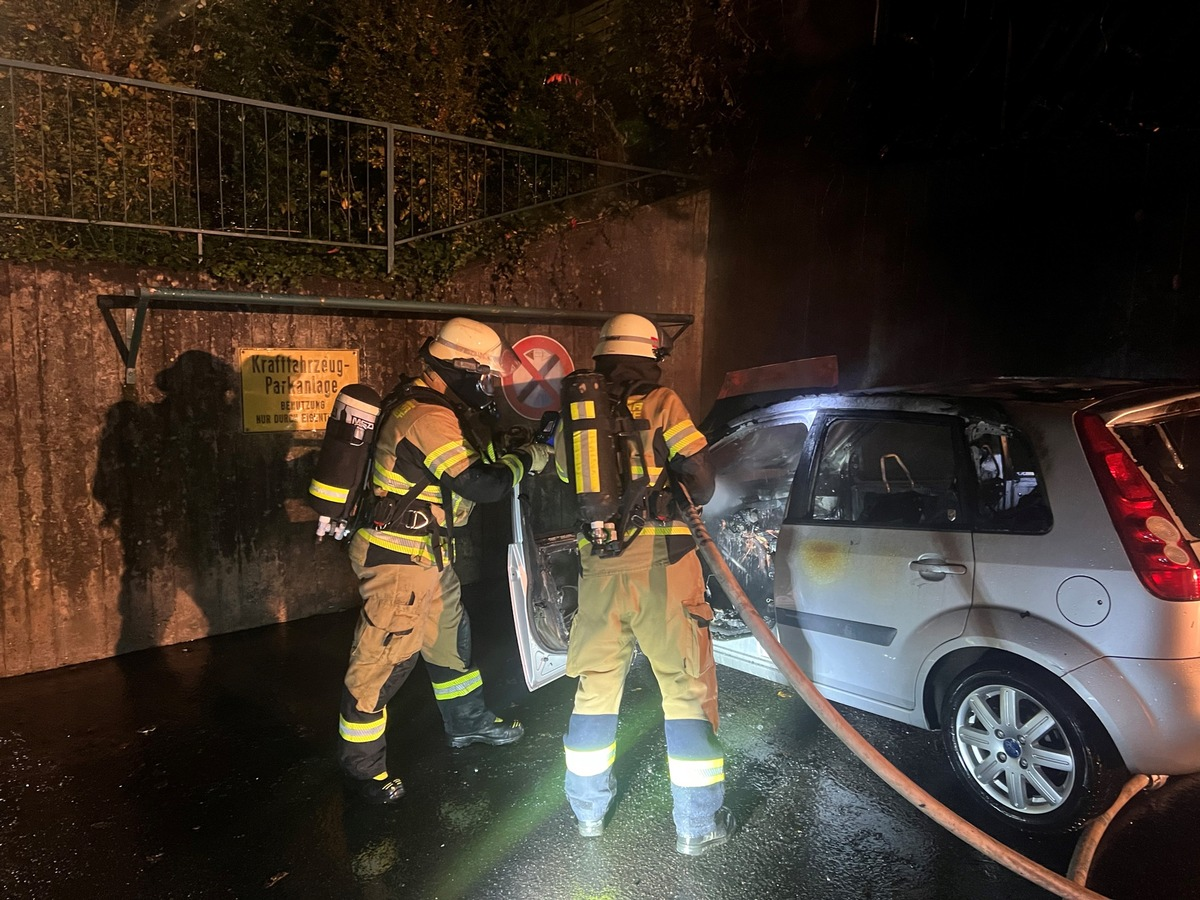 Bad Honnef, Linzer Straße, 01.11.2023, 02:23 Uhr - Um 02.23 Uhr am Mittwochmorgen wurde der Leitstelle Rhein-Sieg ein brennender PKW gemeldet. Diese alarmierte daraufhin den Löschzug Bad Honnef. Als das erste Löschfahrzeug an der Einsatzstelle eintraf, stand der PKW bereits in Vollbrand. Die Flammen schlugen mehrere Meter über das Fahrzeug hinaus. Auf dem direkt angrenzenden Nachbargrundstück waren bereits ein Zaun und eine Hecke in Brand geraten und die Flammen drohten auf eine Garage und das Nachbarhaus überzugreifen. Der Einsatzleiter erhöhte sofort die Alarmstufe auf B3 und alarmierte so weitere Kräfte nach. Ein erster Angriffstrupp unter Atemschutz baute eine Riegelstellung zum Nachbargrundstück auf und löschte dabei auch den Zaun und die Hecke. Ein zweites C-Rohr wurde direkt danach vorbereitet und durch einen zweiten Trupp zum Löschen des Fahrzeugs vorgenommen. So konnte das Feuer schnell unter Kontrolle gebracht werden und die Ausbreitung wurde gestoppt. Eine direkt neben der Einsatzstelle liegende Tiefgarage wurde stark verraucht. Mit einem Überdrucklüfter wurde der Rauch aus der Garage gedrückt. Nach der Rückmeldung "Feuer aus" an die Leitstelle wurde die Einsatzstelle an die Polizei übergeben, die das Fahrzeug sicherstellte und die Ermittlungen übernimmt. Im Einsatz waren etwa 30 Einsatzkräfte der Einheiten Löschzug Bad Honnef, Löschgruppe Rhöndorf und der Führungsdienst. Auch der Rettungsdienst war mit einem Fahrzeug vor Ort. Die Einsatzleitung hatte OBM Jörg Olbermann.