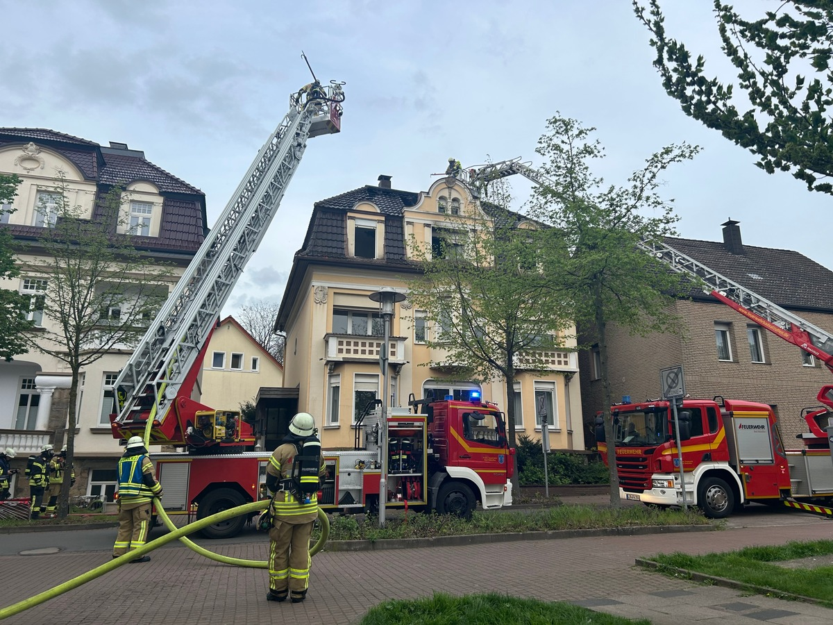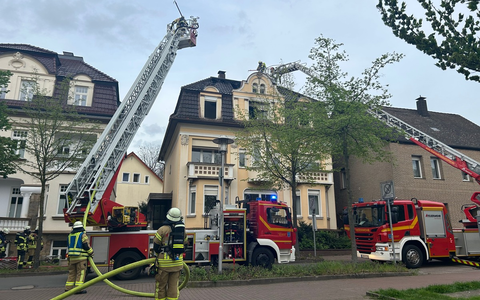 Bad Salzuflen - (nkeu). Zu einem Dachstuhlbrand mit Personen im Gebäude ist die Freiwillige Feuerwehr Bad Salzuflen am frühen Sonntagabend (14.04.2024) in die Osterstraße alarmiert worden. Was zunächst als "Feuer 2 - unklare Rauchentwicklung" gemeldet wurde, stellte sich schnell als größerer Einsatz für die Feuerwehr heraus. Gegen kurz nach 18 Uhr gingen die ersten Notrufe über eine Rauchentwicklung in einem Wohnhaus in der Osterstraße ein. Durch mehrere weitere Anrufer erhöhte die Leitstelle drei Minuten später das Einsatzstichwort auf "Feuer mit Menschenleben in Gefahr - Dachstuhlbrand". Bei Eintreffen der Einsatzkräfte befand sich der hintere Teil des zweiten Obergeschosses sowie der Dachstuhl in Vollbrand. Ein Trupp ging unter schwerem Atemschutzgerät in den Innenangriff zunächst zur Menschenrettung vor. Zeitgleich wurden zwei Drehleitern in Stellung gebracht, um von mehreren Seiten des Gebäudes jeweils einen Löschangriff vorzunehmen. Bei Betreten des Gebäudes kam den Einsatzkräften bereits ein Bewohner entgegen, sodass dieser unverzüglich aus dem Gebäude gebracht wurde. Verletzt wurde er glücklicherweise nicht. Da sich keine weiteren Personen im Gebäude befanden, konnten die Einsatzkräfte sich im Anschluss auf die Brandbekämpfung fokussieren. Es wurden anfangs zwei Einsatzabschnitte - Brandbekämpfung sowie Atemschutz - gebildet. Nach circa 45 Minuten war das Feuer unter Kontrolle. Die folgenden Nachlöscharbeiten gestalteten sich allerdings als schwierig. Mittels Einreißhaken wurde über die beiden Drehleitern das Dach geöffnet. Da es sich bei dem betroffenen Gebäude um einen Altbau mit Zwischendecke handelte, war das Erreichen der Glutnester von außen kaum möglich. Weitere Trupps unter schwerem Atemschutzgerät übernahmen die Arbeiten von innen. Ein dritter Abschnitt wurde durch die Gruppe Absturzsicherung gebildet, die sich während der Nachlöscharbeiten in Bereitschaft befand. Während des Einsatzes stellte die Löschgruppe Biemsen-Ahmsen den Grundschutz für die Stadt Bad Salzuflen sicher. Ebenso unterstützten die ehrenamtlichen Kräfte des Rettungsdienstes und sowie Kräfte des Kreises Lippe, welche mit dem Abrollbehälter Atemschutz in die Osterstraße anrückten. Die circa 100 Einsatzkräfte der Einheiten Schötmar Werl-Aspe, Bad Salzuflen, Wüsten und Holzhausen sowie des Hauptamtes konnten aufgrund der komplizierten Nachlöscharbeiten erst spät in der Nacht zu Montag wieder einrücken. Das Gebäude ist unbewohnbar. Zur Brandursache hat die Polizei die Ermittlungen aufgenommen.