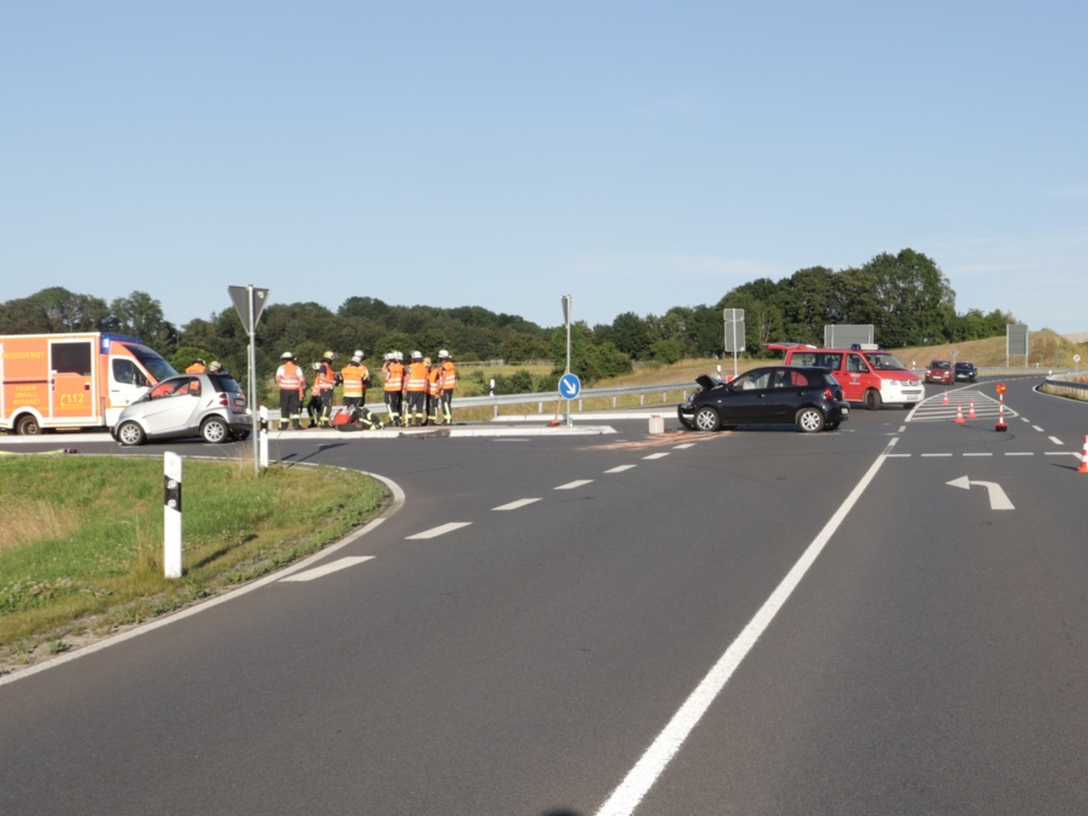 10.07.2024 - 14:10:38 | presseportal.deAm Dienstag, 9. Juli, gegen 18.55 Uhr fuhr ein grauer Smart von Würgassen kommend die L 763 und wollte dann nach links auf den Auffahrtsarm nach Herstelle einbiegen. Zunächst kamen dem 18-jährigen Smart-Fahrer zwei Fahrzeuge entgegen, die ebenfalls auf den Abfahrtarm einbiegen wollten. Allerdings achtete der 18-Jährige dann nicht mehr auf einen Nissan Micra, der noch hinter den beiden unterwegs war und geradeaus in Richtung Würgassen fahren wollte. Als der Smart losfuhr, kam es zum Zusammenstoß.