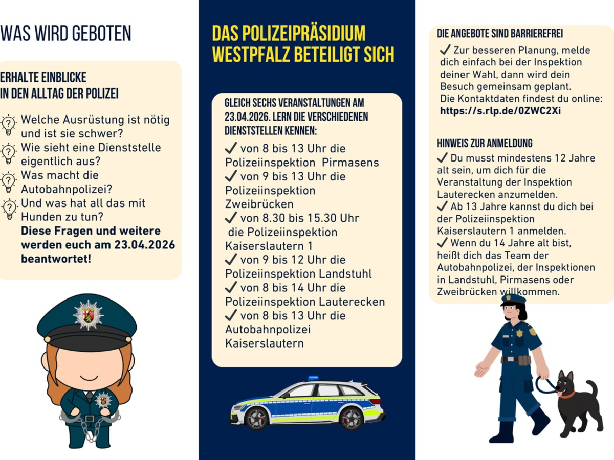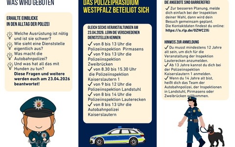 08.04.2026 - 09:19:05 | presseportal.deDie Besucherinnen erwartet in der Zeit von 8 - 14 Uhr ein abwechslungsreiches Programm mit praxisnahen Einblicken: Welche Ausrüstung wird im Einsatz benötigt? Wie sieht eine Polizeidienststelle von innen aus? Diese und viele weitere Fragen werden vor Ort beantwortet.