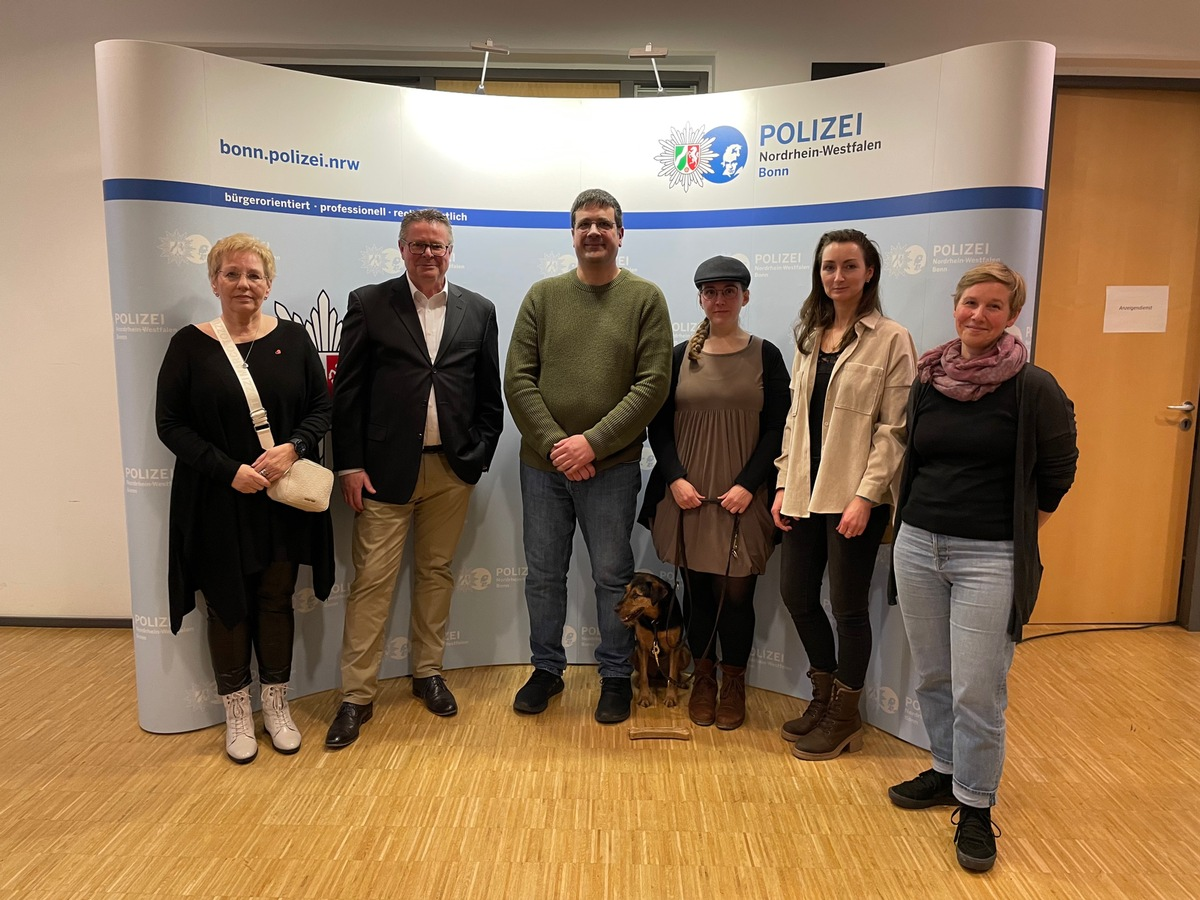 Am 28.11.2023 halfen eine 33-jährige Frau und ihre Hündin, das Leben einer jungen Frau zu retten. Diese hatte zuvor gegenüber Polizeibeamten, einer Notärztin und den Notfallsanitätern angekündigt, in den Rhein zu springen. Das Brückengeländer am Bonner Leinpfad hatte sie bereits überstiegen. Eine gefahrlose Annäherung an die Frau war den Ersthelfern nicht möglich. Dies änderte sich, als die 33-jährige Bonnerin mit ihrer Hündin Tina an dem Ereignisort vorbeikam. Die junge Frau zeigte Interesse an der Hündin. So entstand ein Gespräch mit der Hundebesitzerin. Sie hatte sich gegenüber den Beamtinnen und Beamten sofort zur Hilfe bereit erklärt. Während der längeren Unterhaltung gelang es den Einsatzkräften von Polizei und Feuerwehr unbemerkt eine günstige Gelegenheit zu schaffen, in der sie die Betroffene sichern und ihr Vorhaben unterbinden konnten. Die junge Frau wurde in ein Krankenhaus gebracht.
