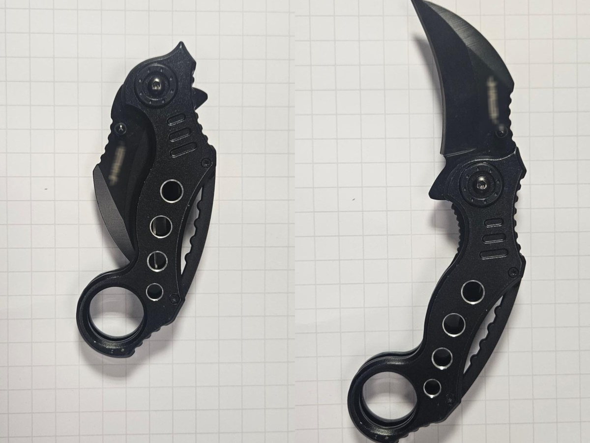 Die Frage, ob er verbotene oder gefährliche Gegenstände mit sich führe, bejahte der Polizeibekannte und wies die Polizisten auf ein Messer in seiner mitgeführten Tasche hin. Dabei handelte es sich um ein Karambit-Messer. Dies ist ein klauenförmiges Messer, dessen Ursprung in Asien liegt. Die Klinge und der Griff weisen einen Bogen auf. Zudem ist der Ring am Ende des Griffes ein typisches Merkmal, mit dem das Messer am kleinen Finger eingehängt werden kann.