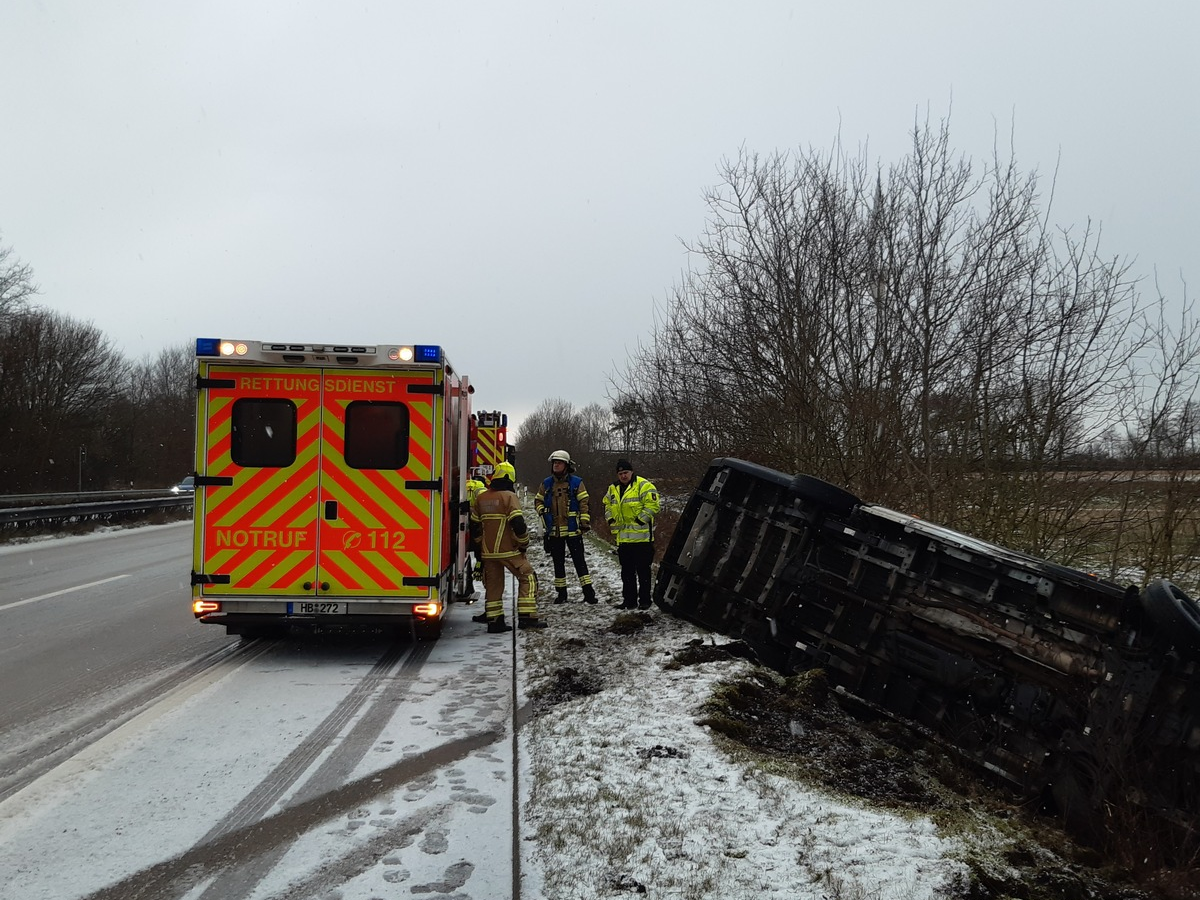 Gegen 10.00 Uhr wurde der Integrierten Regionalleitstelle ein Verkehrsunfall zwischen den Anschlussstellen Debstedt und Neuenwalde gemeldet. Ein Kleintransporter hatte sich überschlagen und befand sich im Grünstreifen rechts neben der Fahrbahn auf der Seite liegend. Die Feuerwehr sicherte die Einsatzstelle ab. Der einzige Insasse wurde an den Rettungsdienst übergeben.