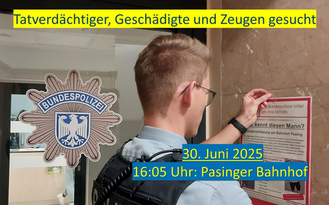 Im Auftrag der Staatsanwaltschaft München I sucht die Bundespolizei auf Beschluss des Amtsgerichtes München mit Lichtbildern nach dem Unbekannten. Diese können auf der Internetseite der Bundespolizei unter nachstehendem Link aufgerufen werden. https://bundespolizei.de/aktuelles/fahndungen/30-juni-2025-gefaehrliche-koerperverletzung-am-bahnhof-muenchen-pasing-01-2026
