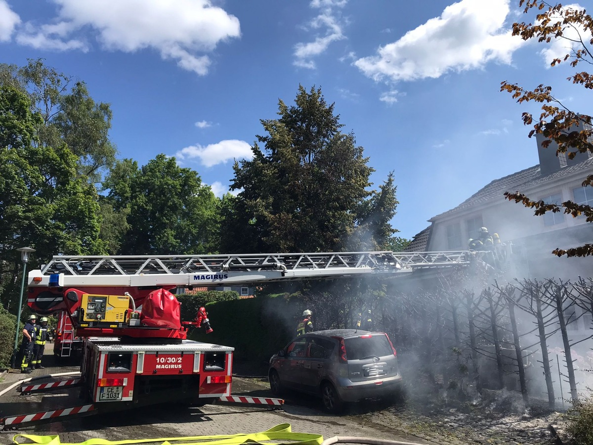 FW Celle: 20 Meter Hecke in Vollbrand - Feuer greift auf Haus, PKW und Baum über!