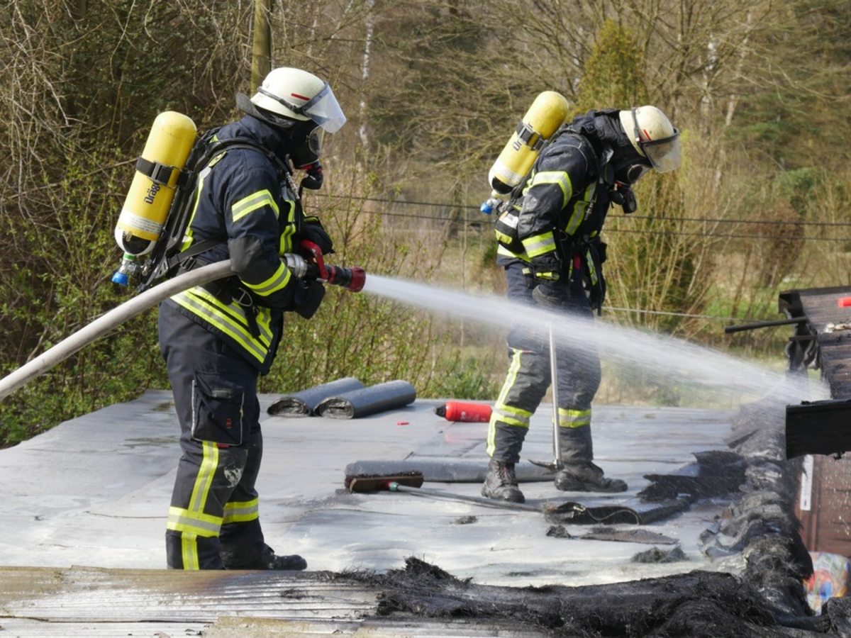 27.03.2024 - 15:35:35 | presseportal.deBei Eintreffen der ersten KrÀfte hatte es im Bereich des Daches eines Holzhauses gebrannt. Das Feuer war durch Anwohner vor Eintreffen der Feuerwehr gelöscht worden. Im Rahmen von Nachlöscharbeiten mussten die EinsatzkrÀfte Teile der Dach- und Wandverkleidung öffnen. Hierbei kamen ein Trupp unter Atemschutz und ein C-Rohr zum Einsatz.
