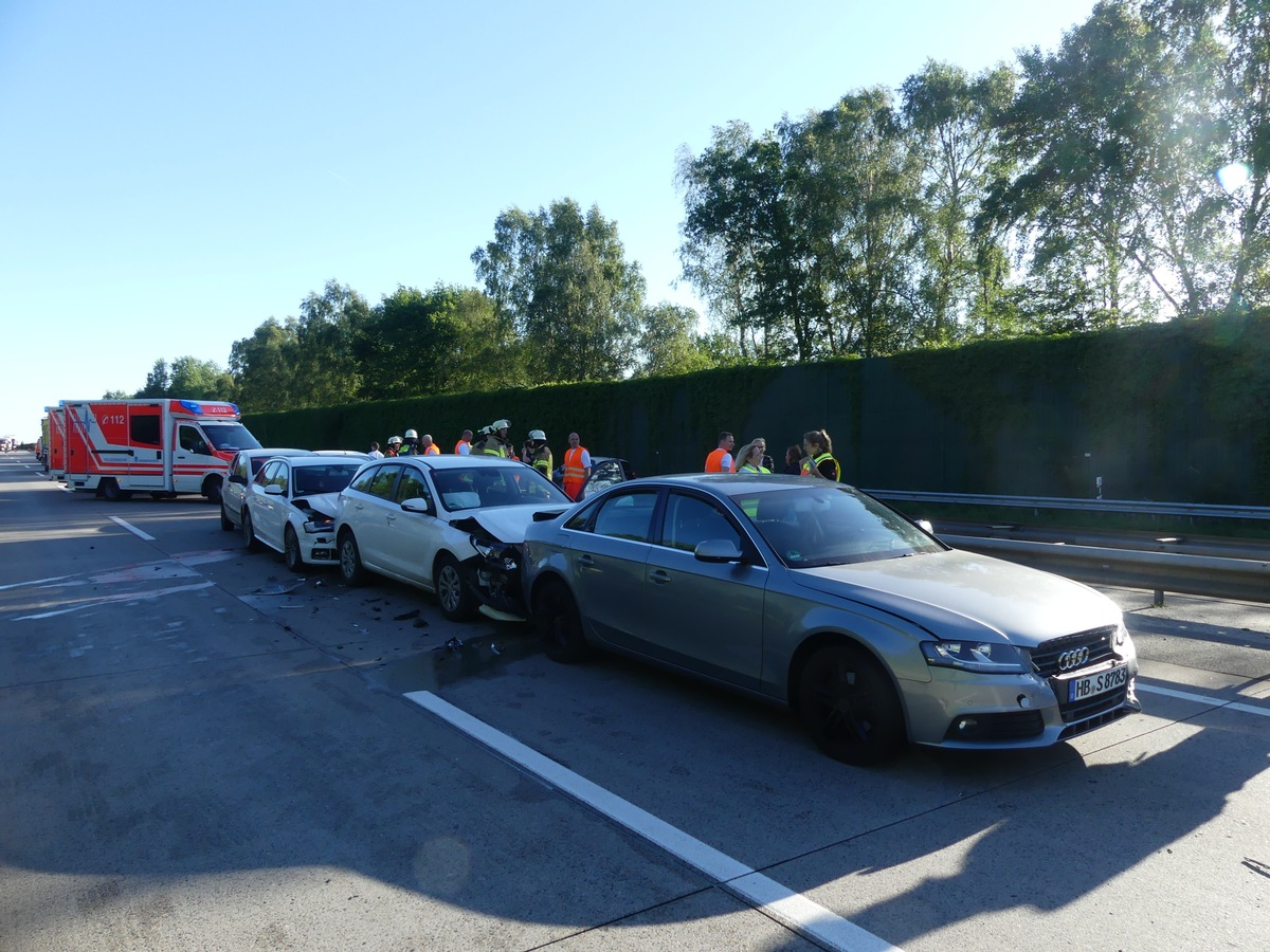 Auf dem Überholfahrstreifen ereignete sich im Zuge dessen ein Verkehrsunfall, bei dem fünf Fahrzeuge beteiligt waren. Zunächst hatte eine 40-Jährige aus der Gemeinde Wurster Nordseeküste einen Auffahrunfall verursacht. Sie war mit ihrem Hyundai I30 auf den Audi A4 einer 36-jährigen Bremerhavenerin aufgefahren. Der Audi wurde hierdurch auf den Hyundai Kona einer 57-Jährigen Geestländerin aufgeschoben. Schließlich reagierten ein 22-Jähriger und eine 29-Jährige, beide auch aus Geestland, zu spät und fuhren ebenfalls mit ihrem Audi A4 Avant, bzw. VW Fox, auf.
