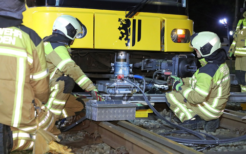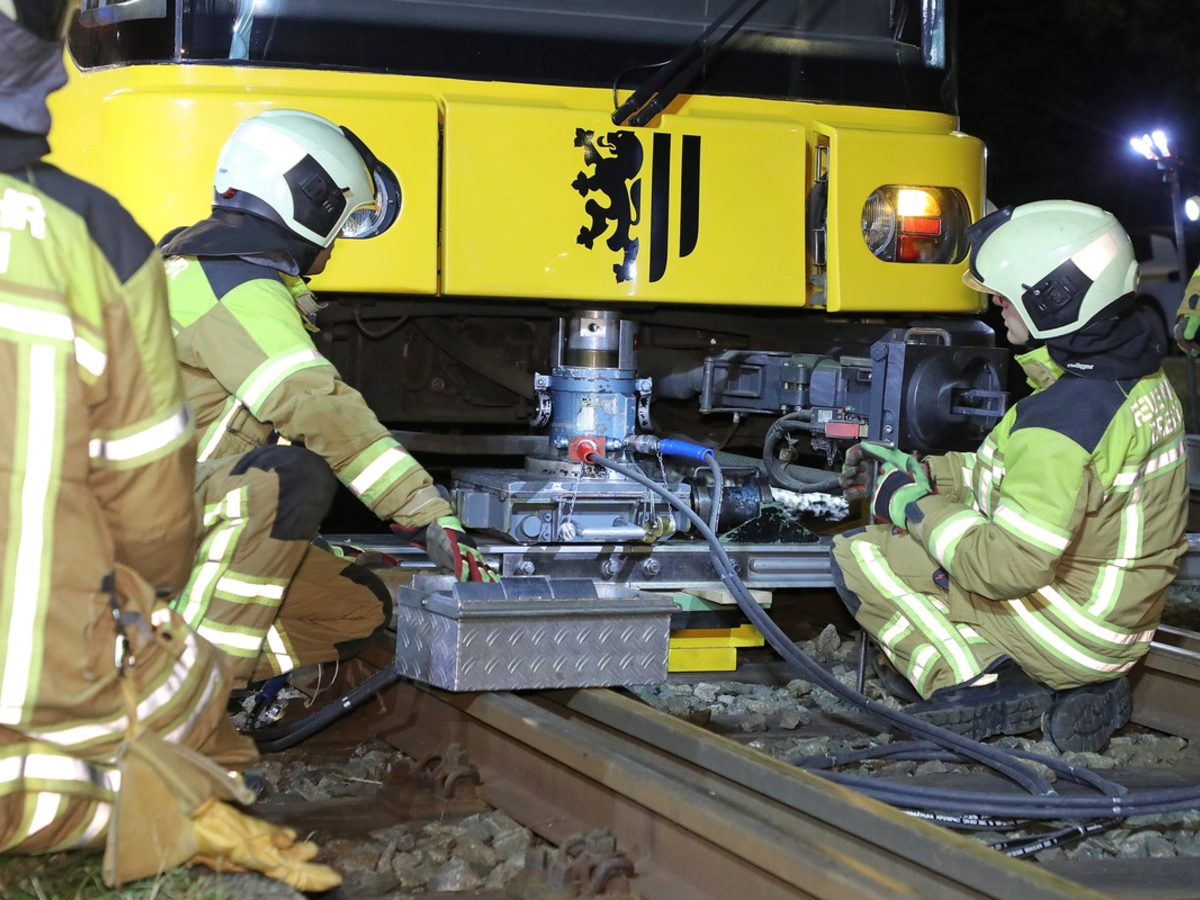 Zwei Stadtbahnwagen der Linie 7 vom Typ NGT 12 und NGT 8 DD sind am heutigen Abend aus noch zu ermittelnder Ursache zusammengestoßen. Dabei wurde eine Person leicht verletzt und vor Ort durch den Rettungsdienst ambulant versorgt. An beiden Straßenbahnen entstand Sachschaden und sie entgleisten infolge des Unfalls. Spezialisten für Straßenbahnhilfeleistung der Feuer- und Rettungswachen Albertstadt und Striesen setzten zunächst die beiden Drehgestelle des Wagenteils 5 des NGT 8 DD wieder ins Gleis. Dazu wurde das Fahrzeug angehoben und mithilfe der Seilwinde des Gerätewagen-Logistik ins Gleis gezogen. Das Fahrzeug konnte bereits den Dresdner Verkehrsbetrieben übergeben werden. Aktuell arbeiten die Einsatzkräfte daran, auch die beiden Drehgestelle des Wagenteils 1 des NGT 12 wieder ins Gleis zu setzen. Diese Aufgabe gestaltet sich aufgrund Z-Stellung des Fahrzeugs auf der Fahrbahn komplexer. Mithilfe hydraulischer Heber und einer Verschiebebrücke wird auch dieses Wagenteil zurück ins Gleis gebracht. Die Arbeiten werden noch einige Zeit in Anspruch nehmen. Während der Einsatzmaßnahmen kommt es im Bereich des Albertplatzes zu erheblichen Verkehrsbehinderungen. Im Einsatz sind 20 Kräfte der Berufsfeuerwehr.
