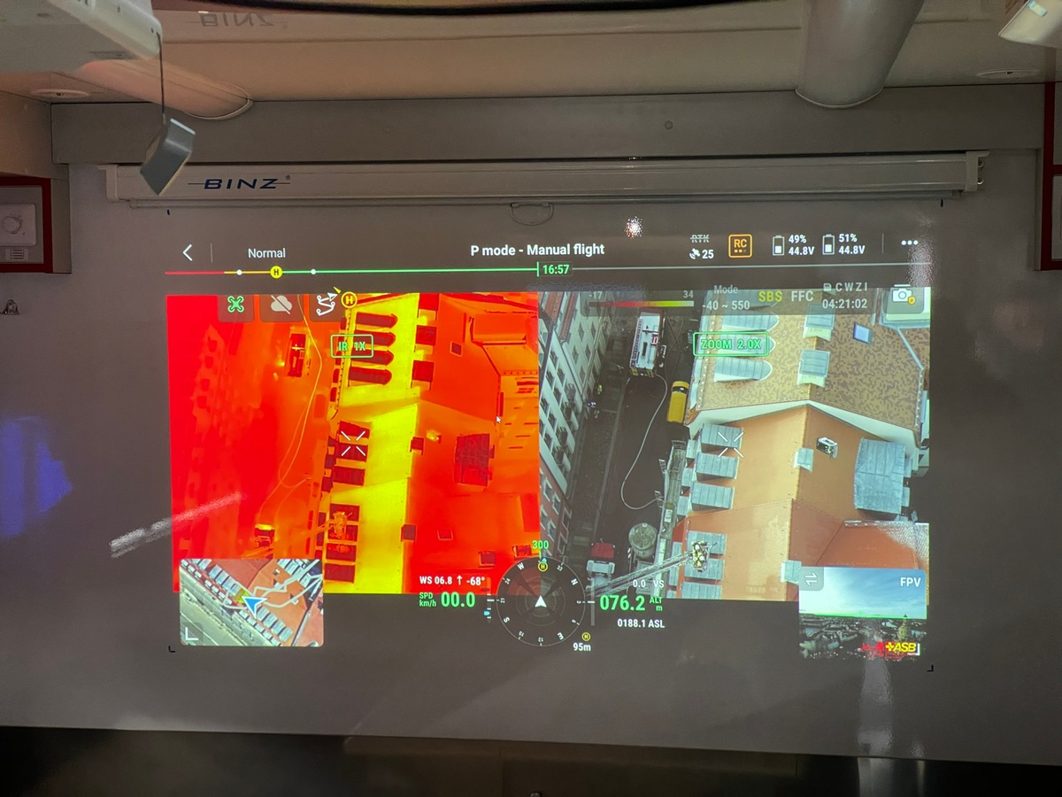 Die Feuerwehr Dresden ist gegenwärtig mit einem Großaufgebot an Einsatzkräften bei einem Dachstuhlbrand im Einsatz. Aus noch zu ermittelnder Ursache war es in einem Wohngebäude, welches derzeit errichtet wird, zu einem Brand im Dachbereich gekommen. Initial waren etwa 40 Quadratmeter betroffen. Teile des Daches stürzten immer wieder nach unten und stellten eine Gefahr dar. Durch die Feuerwehr wurden zwei Bauarbeiter aus dem Dachgeschoss gerettet. Sie blieben unverletzt. Für die Feuerwehr ist die Lage jedoch besonders herausfordernd, da der Zugang zum Dachbereich nur über einen Innenhof möglich und der Brandherd mit tragbaren Leitern bzw. Drehleitern nicht zu erreichen ist. Die initial durchgeführten Löschmaßnahmen erzielten nicht den gewünschten Erfolg. Aus diesem Grund breitete sich der Brand weiter aus. Mit Unterstützung der Drohnenstaffel des ASB gelang es, eine Gesamtansicht aus der Luft zu bekommen, um die Löschmaßnahmen besser steuern zu können. Durch die Spezialisten der Höhenrettung werden die Einsatzkräfte gesichert und können so effektiv die Brandbekämpfung auf dem Dach durchführen. Damit wird der Gefahr des Absturzes optimal begegnet. Mit diesen umfassenden Maßnahmen ist es gelungen, die Ausbreitung zu stoppen. Der Brand ist mittlerweile gelöscht. Die Restlöscharbeiten werden noch einige Zeit in Anspruch nehmen, da große Teile der Dachhaut aufgenommen werden müssen, um an verborgene Glutnester heranzukommen. Dazu kommen auch Wärmebildkameras zum Einsatz. Der gesamte Bereich um die Landhausstraße sowie Teile des Neumarktes an der Frauenkirche sind gesperrt. Immer wieder mussten Passanten, welche versucht haben in Hotels oder Tiefgaragen zu gelangen, auf die Absperrungen hingewiesen werden.