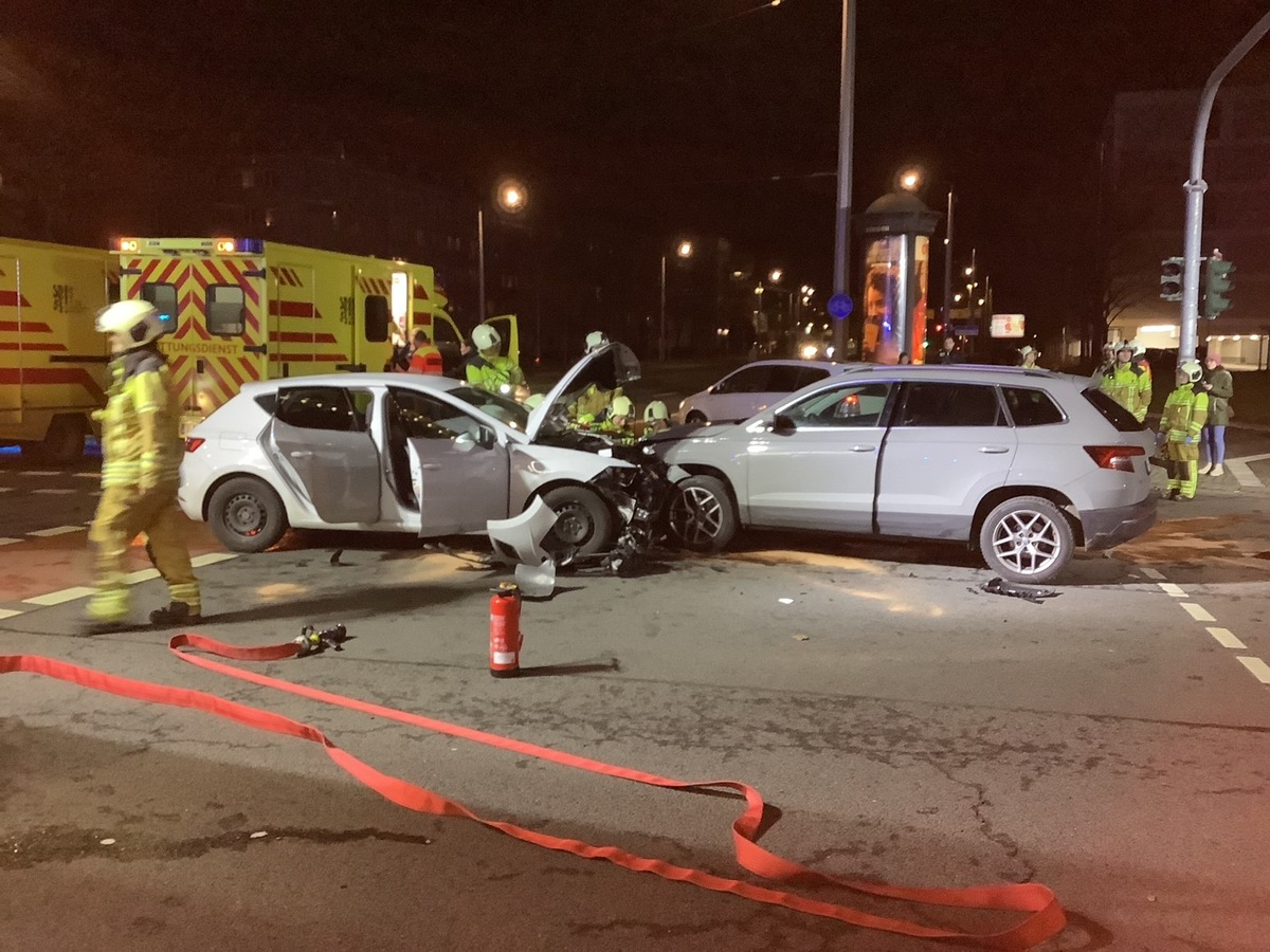 Aus noch zu ermittelnder Ursache kam es zu einem Verkehrsunfall mehrerer Fahrzeuge. Die Integrierte Regionalleitstelle alarmierte zahlreiche Rettungskräfte, da es sich um drei Fahrzeuge handelte und ca. acht Verletzte gemeldet waren. Die ersteintreffenden Kräfte konnten dies bestätigen. Im Kreuzungsbereich waren zwei Fahrzeuge (Skoda und Seat) frontal verunfallt, ein drittes Fahrzeug (Peugeot) war ebenfalls beteiligt. Durch die Feuerwehr wurde die Einsatzstelle großräumig abgesperrt und anschließend ausgeleuchtet, die auslaufenden Betriebsmittel wurden durch die Feuerwehr gebunden und aufgenommen. Durch die Kräfte des Rettungsdienstes wurde eine notärztliche Erstversorgung durchgeführt. Acht Patienten wurden als leichtverletzt und eine Patientin wurde als mittelverletzt eingestuft. Alle Verletzten wurden in die umliegenden Krankenhäuser transportiert.