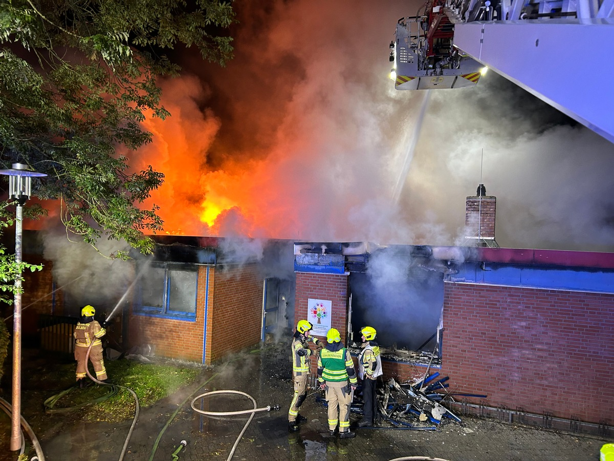 Dülmen - Um 3:58 Uhr wurden die Züge, Dülmen Mitte, Welte, sowie die hauptamtliche Wache und ein RTW zum städtischen Spiekerhof Kindergarten gerufen, hier sollte ein Zimmer brennen. Bereits auf der Anfahrt teilte die Leitstelle mit, dass weitere Anrufer die Meldung bestätigen. Die Maßnahmen wurden unter Atemschutz durchgeführt Aufgrund von einstürzenden Dachteilen musste dies abgebrochen werden. Die Flammen haben sich auf den gesamten Kindergarten ausgebreitet. Es wurden Kräfte aus Hausdülmen, Daldrup nachgefordert, um genug Atemschutzgeräteträger vor Ort zu haben. Der Löschzug Buldern übernimmt den Grundschutz an der Wache. Um die Verpflegung kümmert sich das deutsche Rote Kreuz. Es sind 40 Einsatzkräfte vor Ort. Für die Brandbekämpfung wird ein Wenderohr über Drehleiter eingesetzt, des Weiteren sind 10 C-Rohre im Einsatz. Das Gebäude ist nicht zu retten. Die Bevölkerung wurde über NINA Warnung über die Rauchentwicklung informiert. Aufgrund der Windrichtung ist der Brandgeruch auch in der Innenstadt wahrnehmbar. Die Einsatzdauer ist unbekannt.