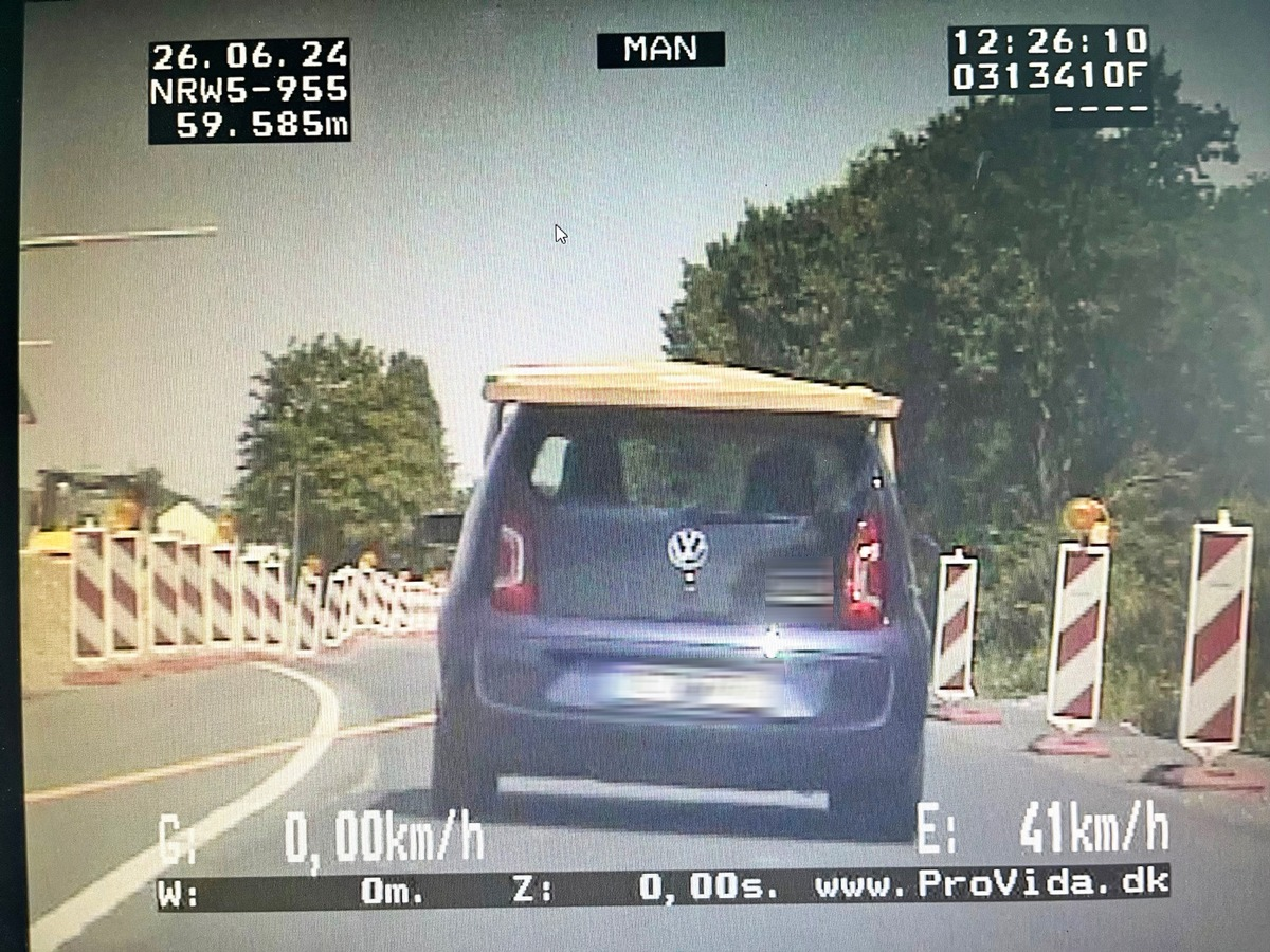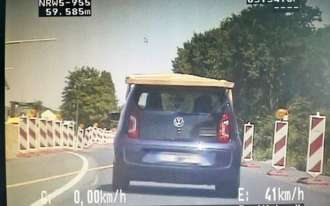 Während seiner Streifenfahrt auf eben jenem Krad fiel dem Experten aus dem Verkehrsdienst gegen 12:25 Uhr dann der junge Fahrer eines VW Up auf, der mit seinem Fahrzeug über die Baumberger Chaussee gefahren war - und dabei auf dem Dach einen riesigen, flachen und augenscheinlich relativ schweren Karton transportierte. Das eigentlich ungewöhnliche daran: Das recht sperrige "Transportgut" war überhaupt nicht gesichert und wurde lediglich vom Fahrer und seinem Beifahrer mit den Armen durch die heruntergelassenen Fenster auf dem Dach festgehalten (siehe Foto) - mit der Folge, dass der Karton ständig auf- und ab sowie hin- und herwippte - und ständig drohte, vom Auto zu fallen. Zudem war der Fahrer dadurch nicht in der Lage, zu blinken oder das Fahrzeug mit beiden Händen zu steuern.