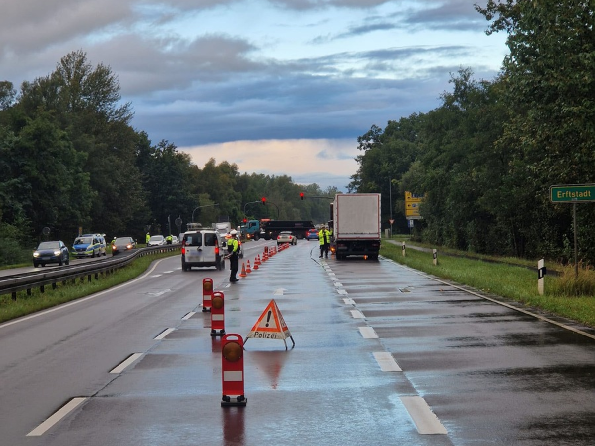 Bei einer groß angelegten Verkehrskontrolle hat die Polizei Rhein-Erft-Kreis am Montagvormittag (9. September) in Erftstadt diverse, teils schwerwiegende Verstöße festgestellt und geahndet. Mit den Polizistinnen und Polizisten des Rhein-Erft-Kreises waren auch Beamte des Hauptzollamts Köln, Fachleute des TÜV Rheinland und der Berufsgenossenschaft Verkehr, dem Bundesamt für Logistik und Mobilität sowie des Verkehrsdienstes der Polizei Köln im Einsatz. Ziel dieser groß angelegten Aktion war die gezielte Kontrolle des Sonder- und Schwerlastverkehrs.