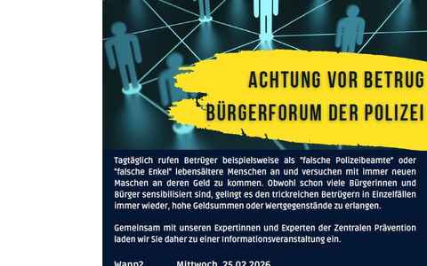 16.02.2026 - 13:19:12 | presseportal.deUm Sie noch besser vor den fiesen Betrugsmaschen zu schützen, organisiert die Polizei Maxdorf gemeinsam mit unseren Präventionsexperten ein Bürgerforum in Fußgönheim.