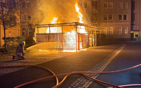 Brand auf Mülltonnenstellplatz - Feuerwehr löscht mit zwei Strahlrohren