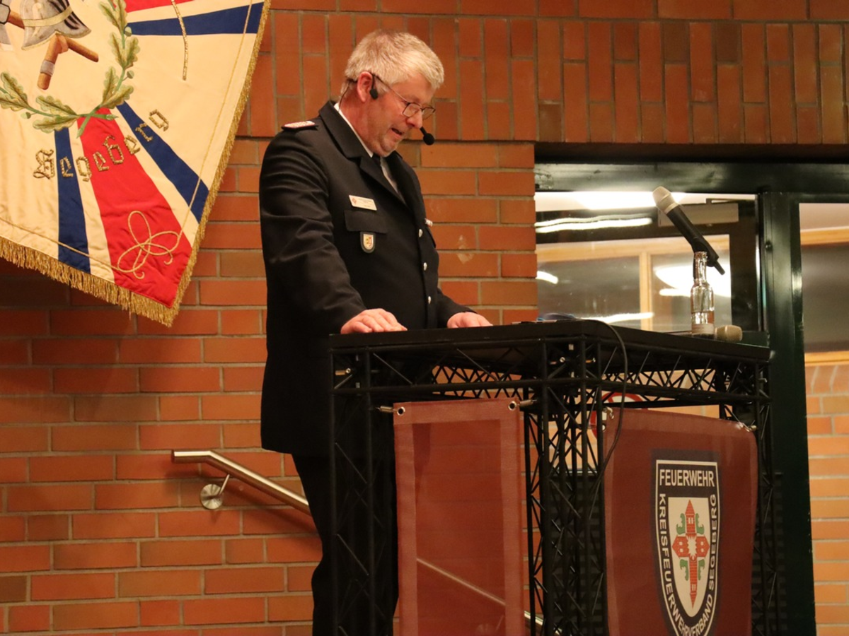 In seiner Eröffnungsrede erörtert der Kreiswehrführer allen Anwesenden einen Rückblick der vergangenen Monaten. Das Jahr war weiterhin geprägt von den Nachwehen der Ostseeflut im vergangenem Jahr sowie den Hochwassereinsatz Anfang Januar auf Fehmarn. In seinem Bericht betont er auch die bisherige Einbindung von Fachwarten aus DRK und THW in feste Alarmierungsabläufe für die Feuerwehren im Kreisgebiet. Dies dient als gute Hilfe für die Einsatzleitung vor Ort.